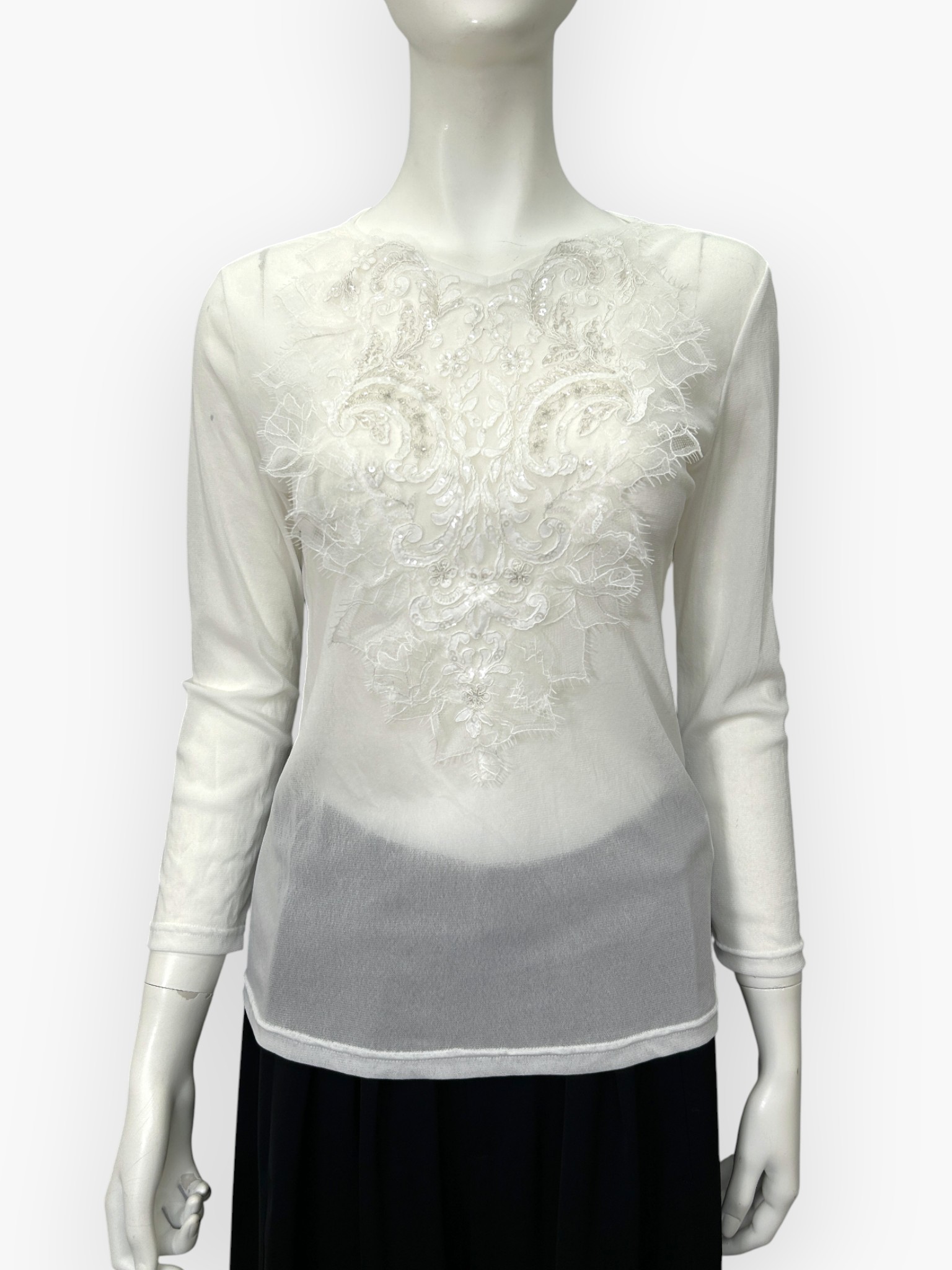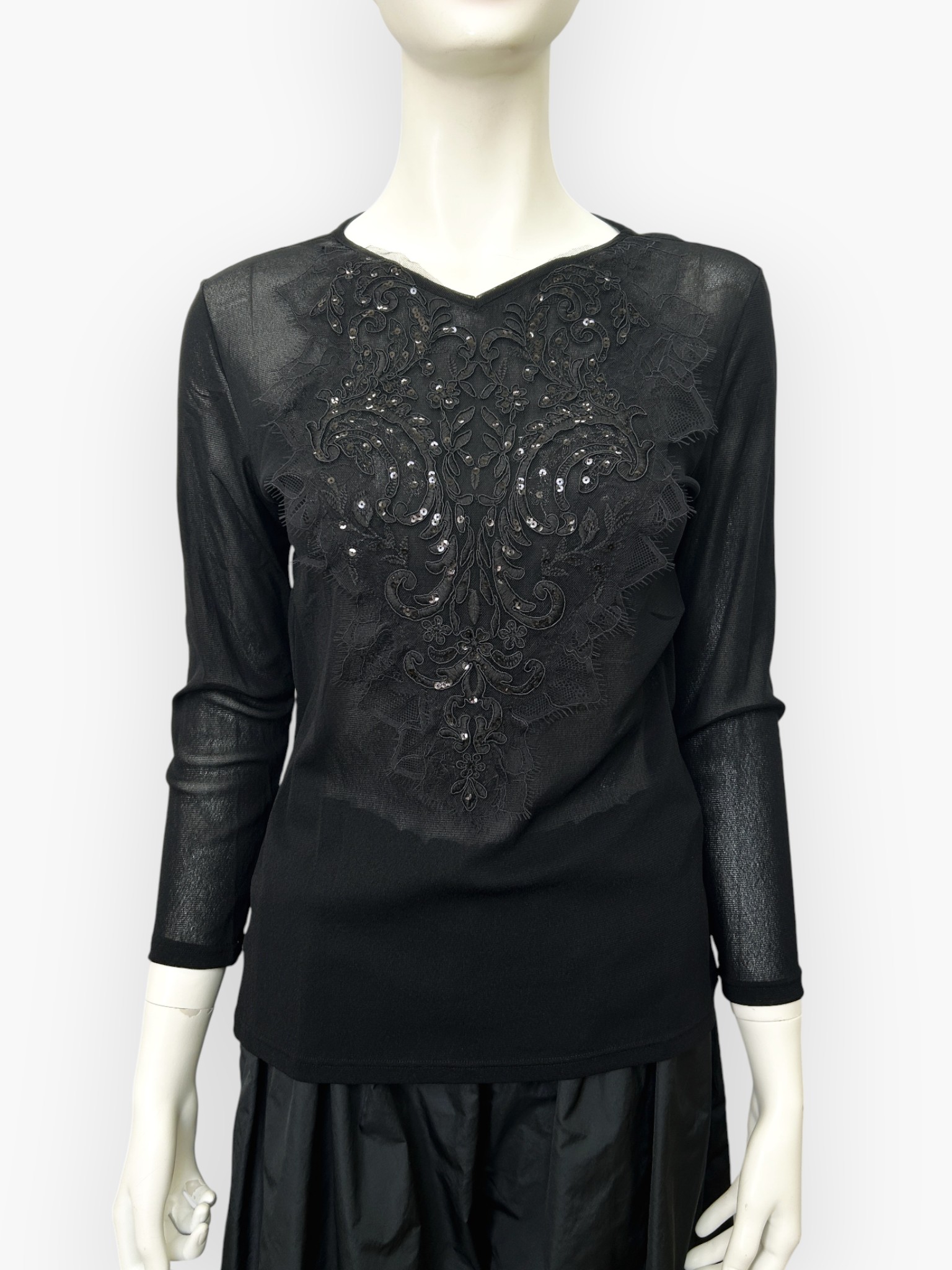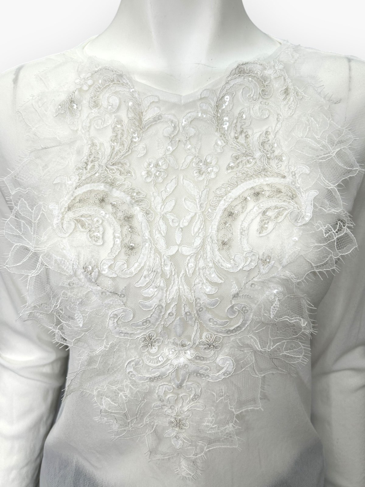 スパンコールや刺繍が豪華なモチーフレースに、リバーレースを組み合わせたレース尽くしのトップス。