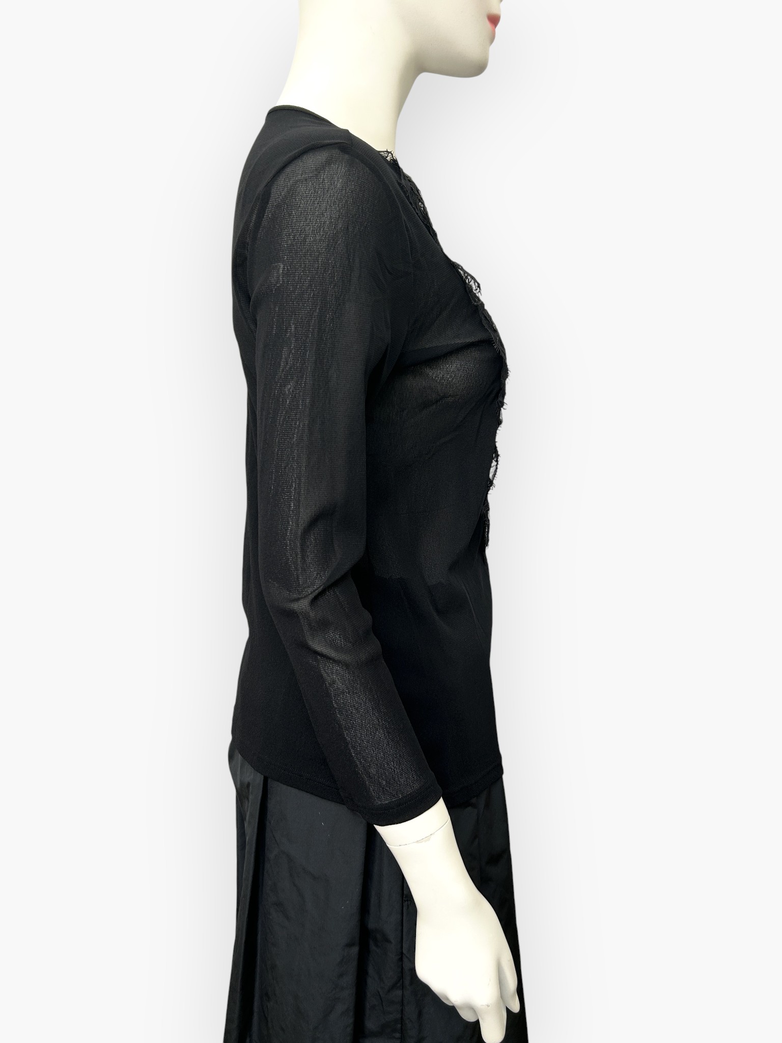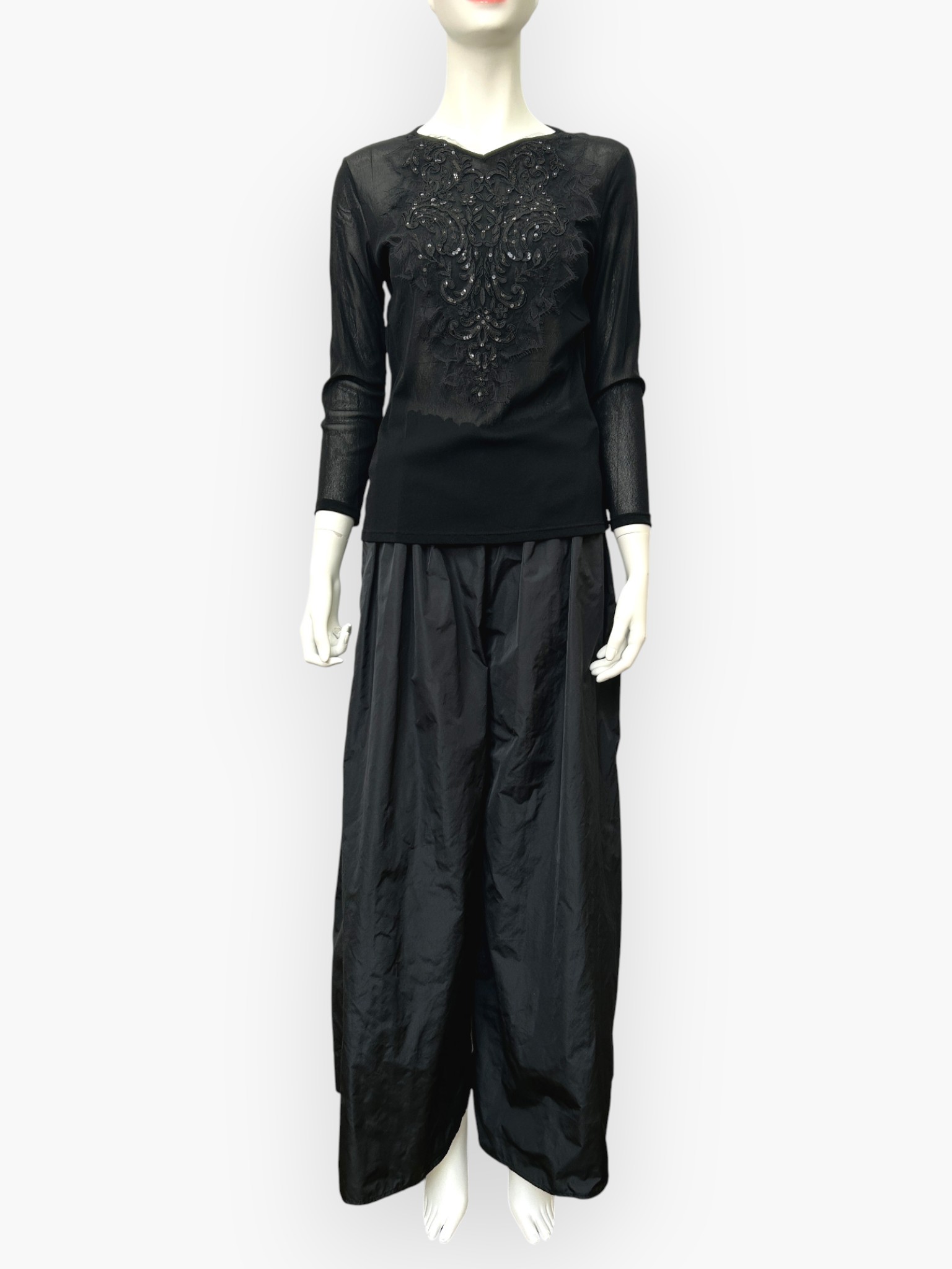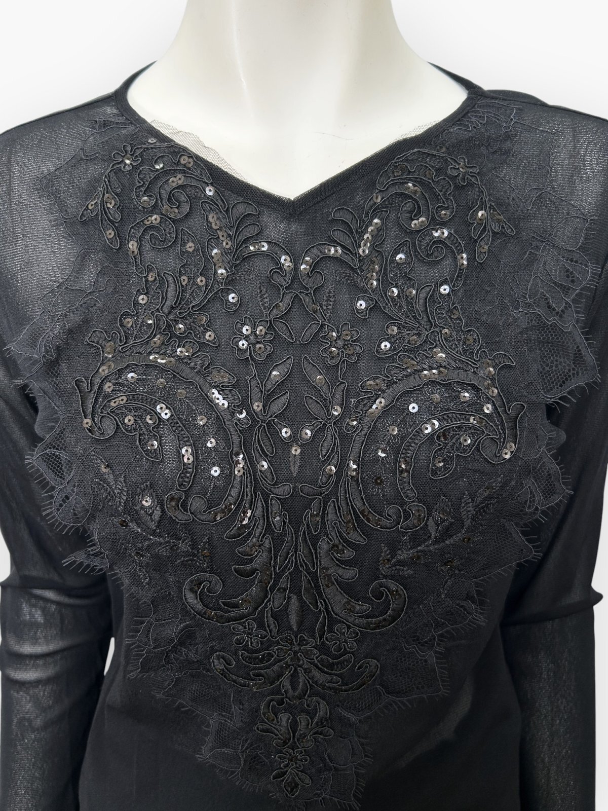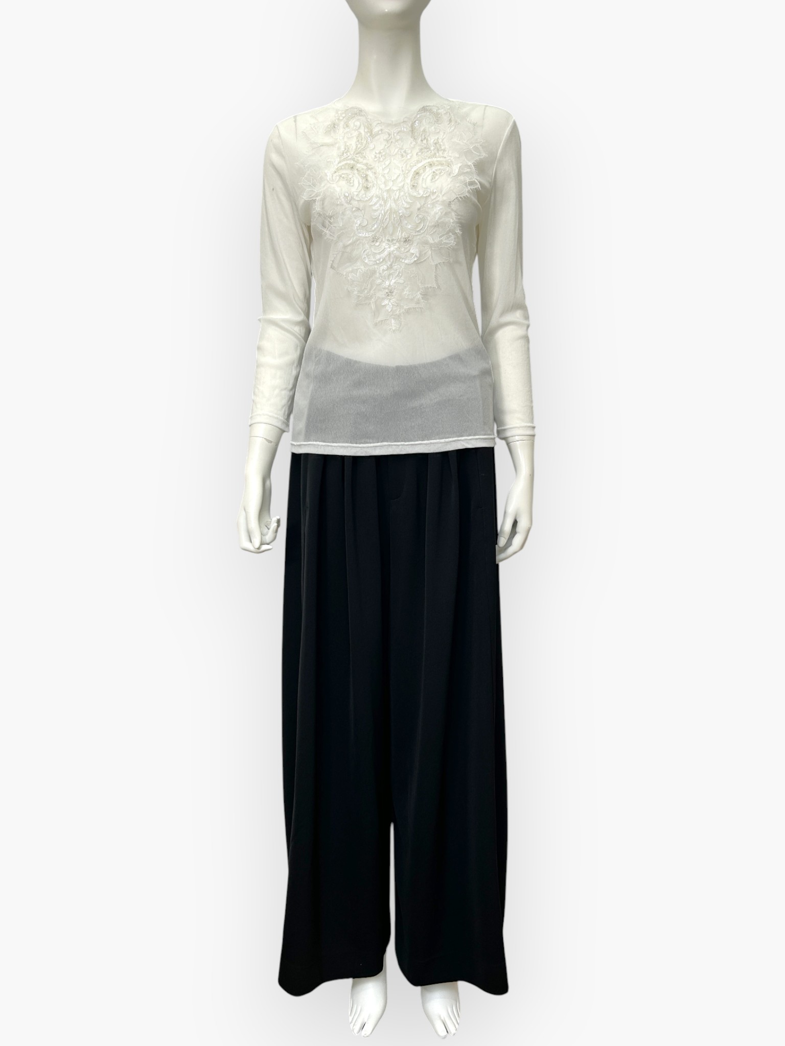 スパンコールや刺繍が豪華なモチーフレースに、リバーレースを組み合わせたレース尽くしのトップス。