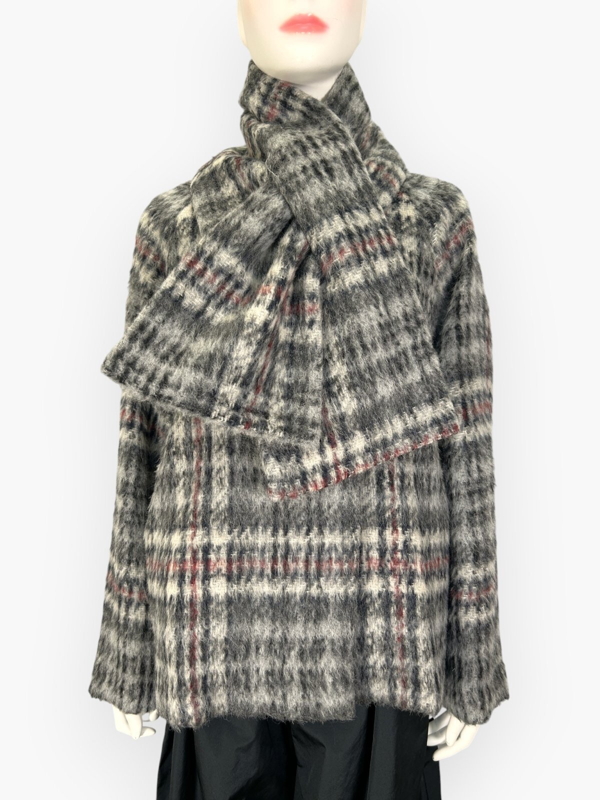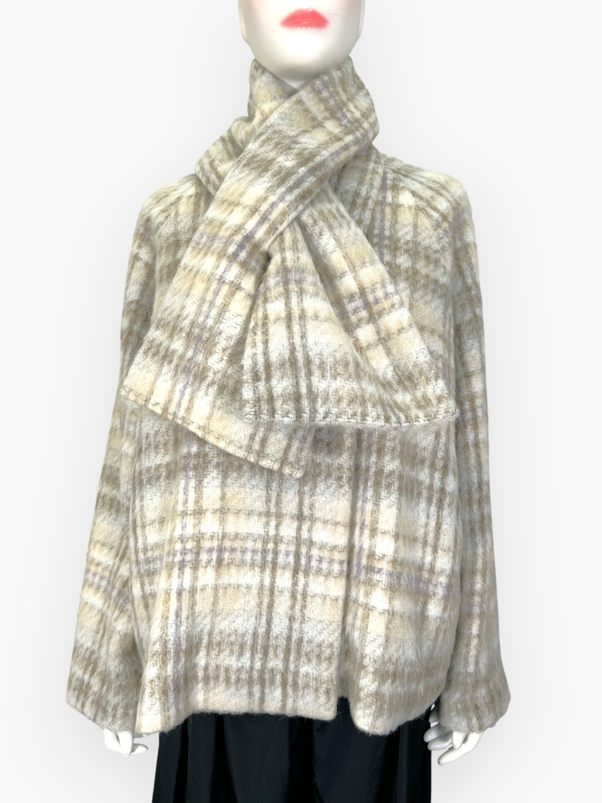 同柄のコンパクトなストール付きで首元まで暖かい一着。