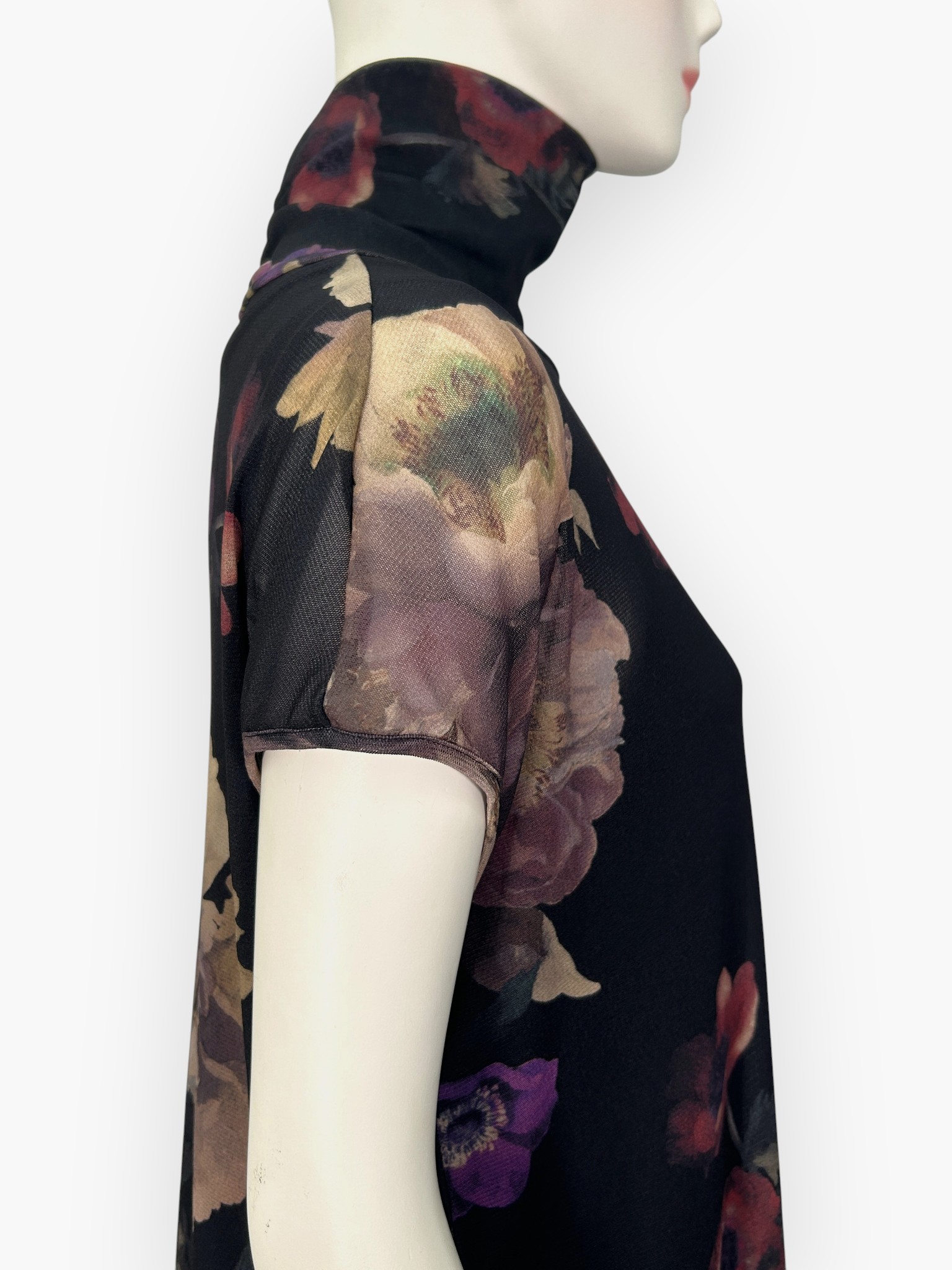 スタンドネックの後ろにギャザーを寄せ柔らかいチュールでも首元のシルエットをキープさせました。