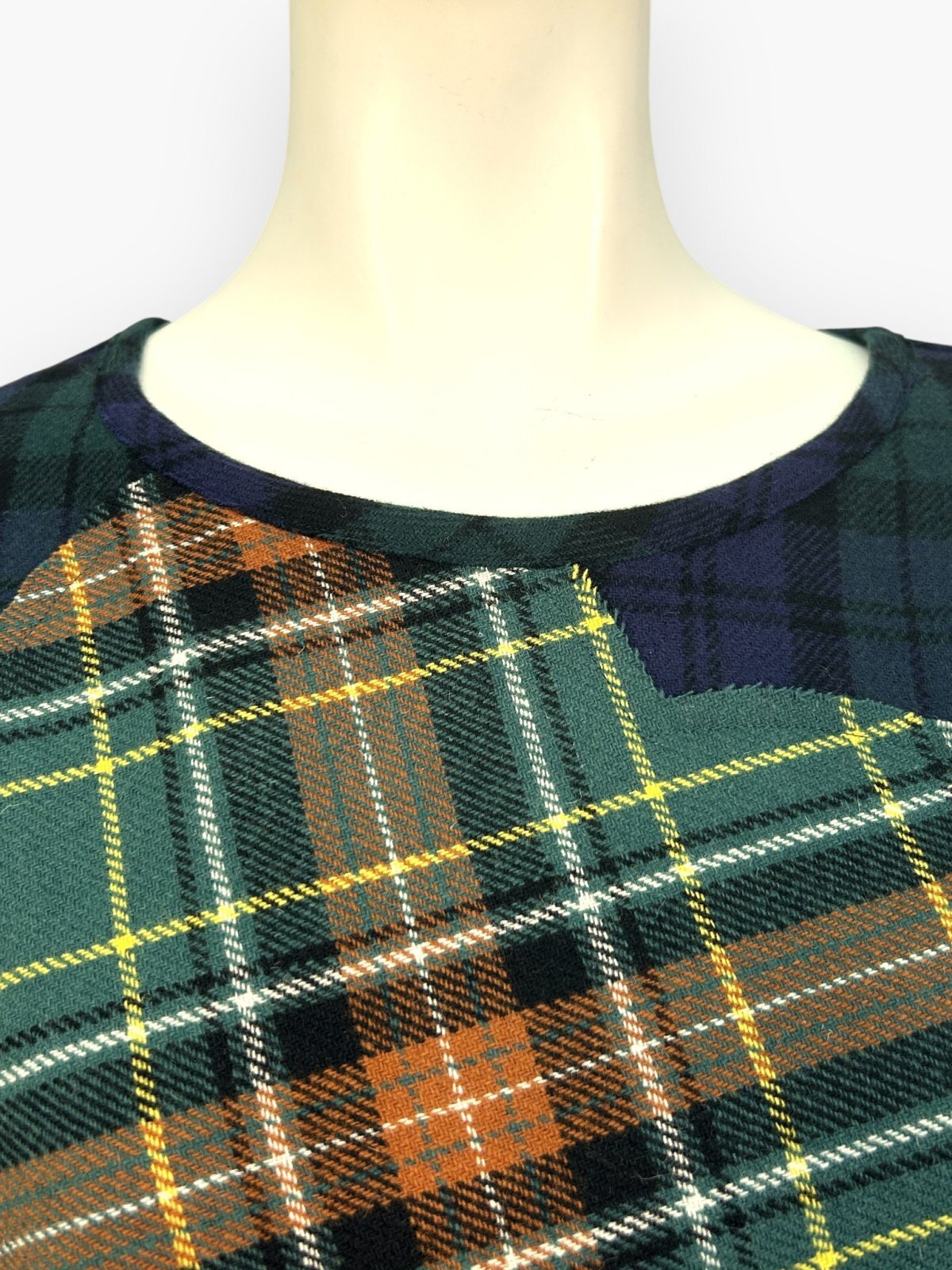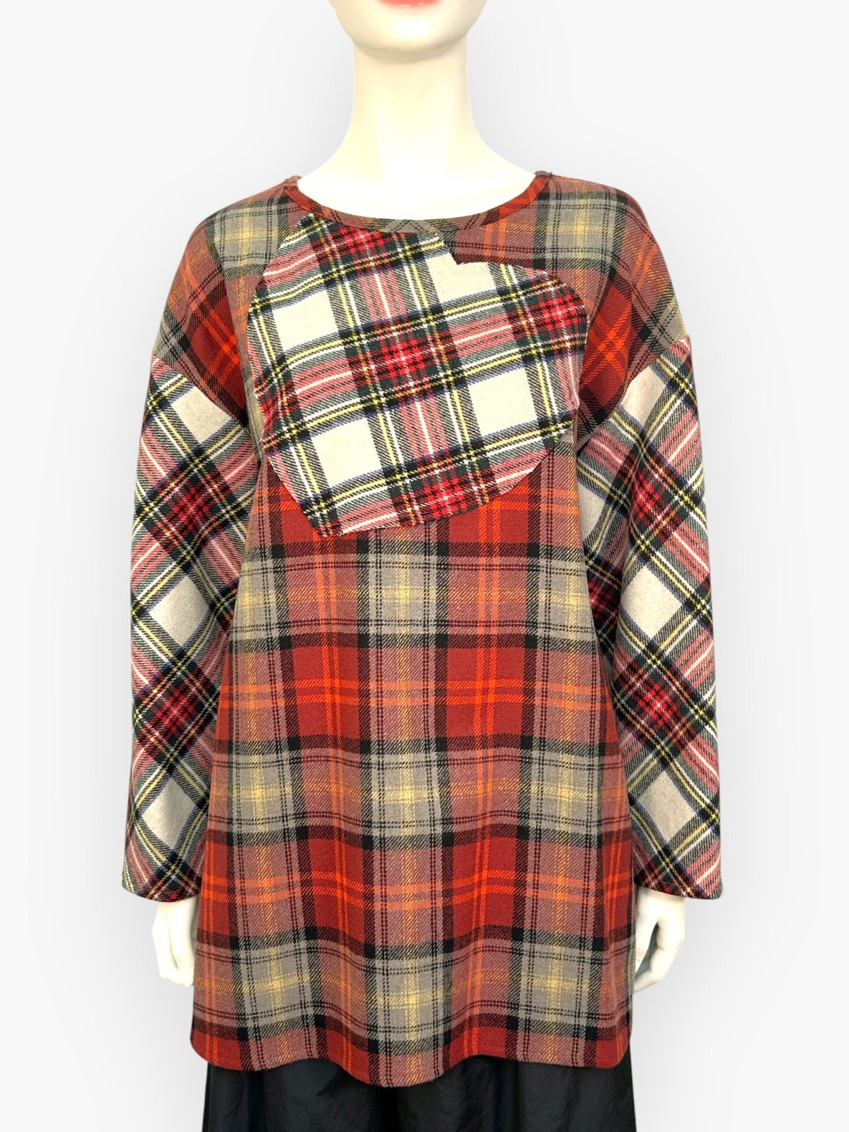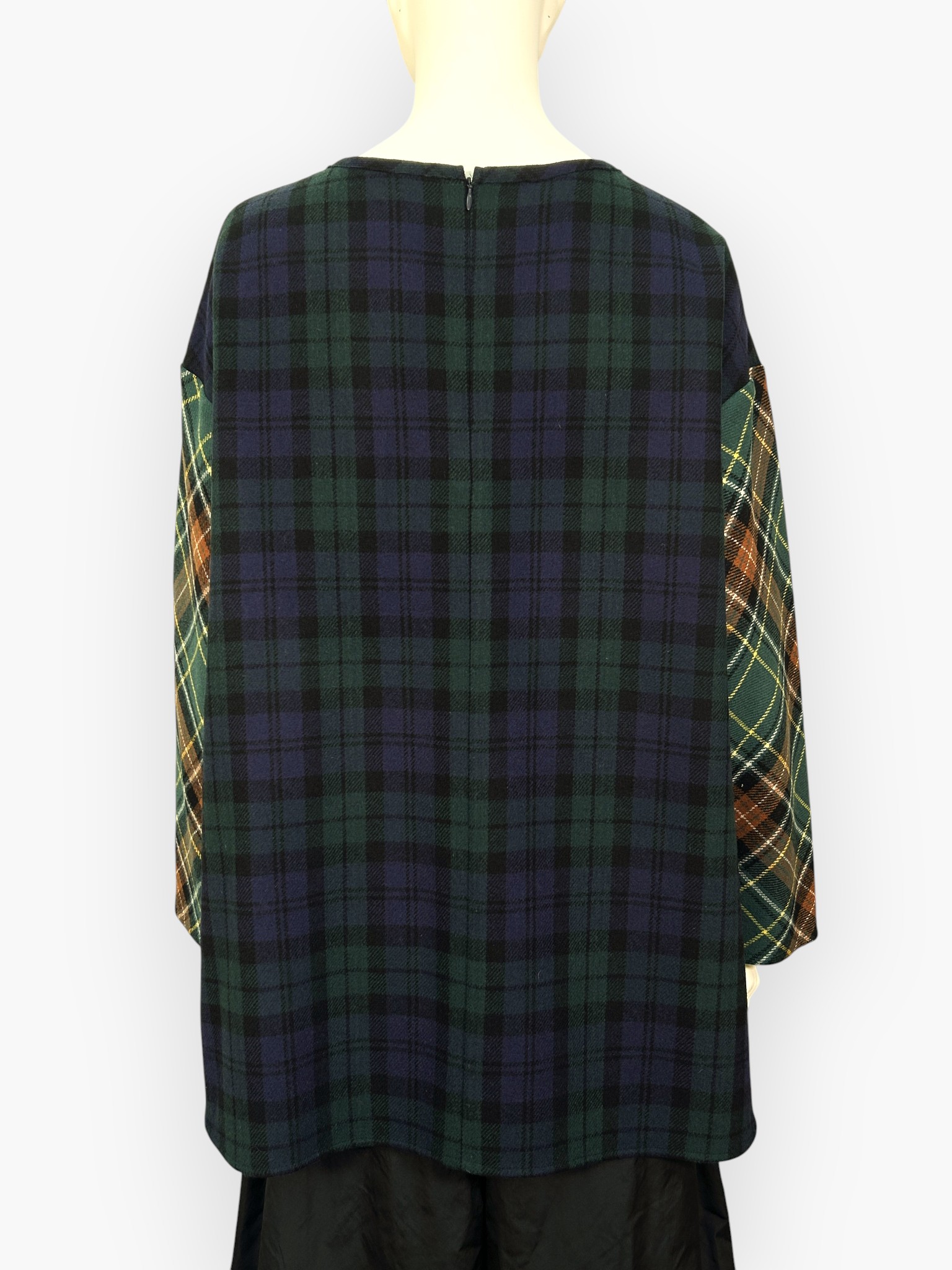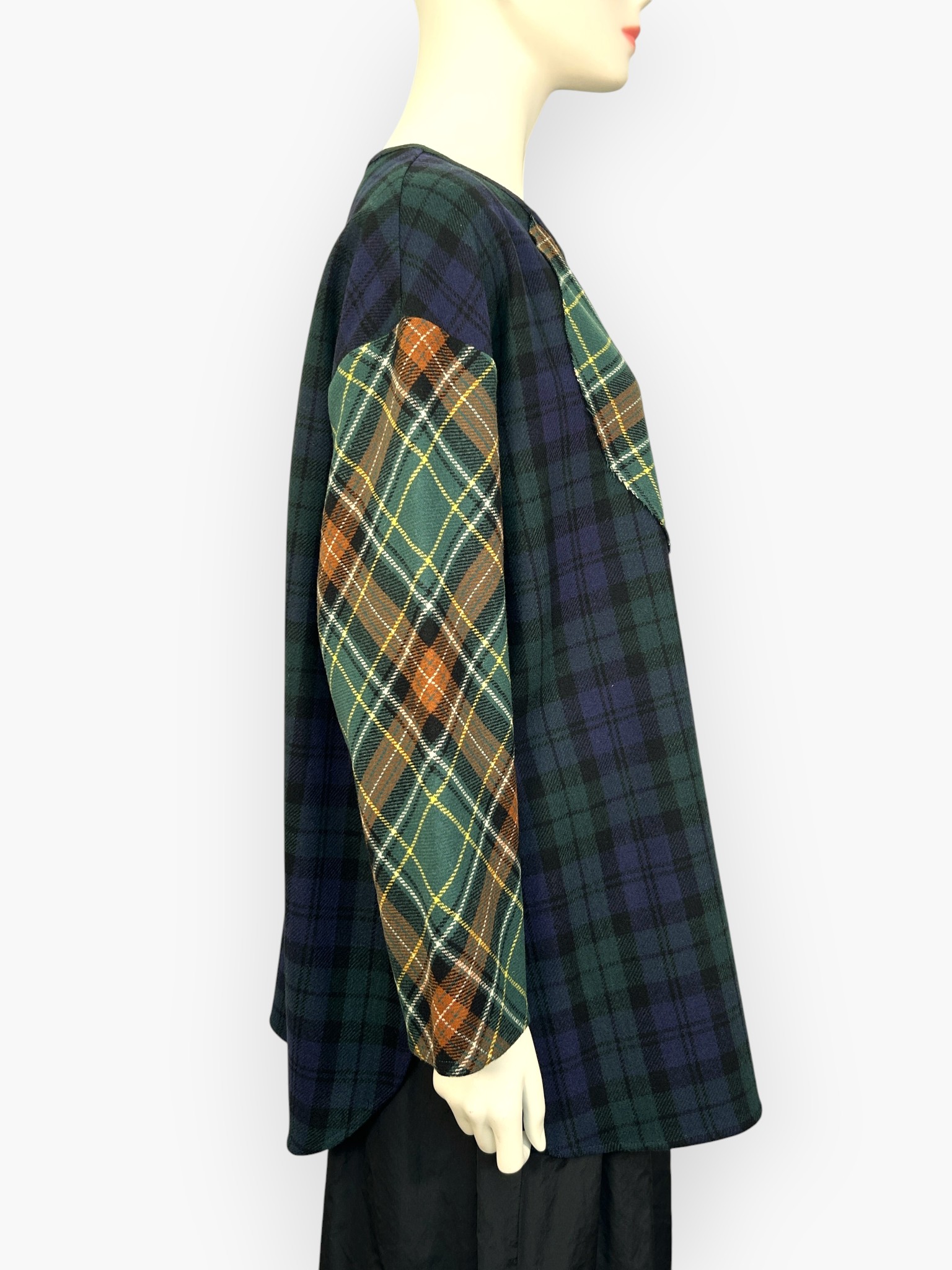色によって柄の異なる複雑なチェック生地を配色で使用したブラウス。
