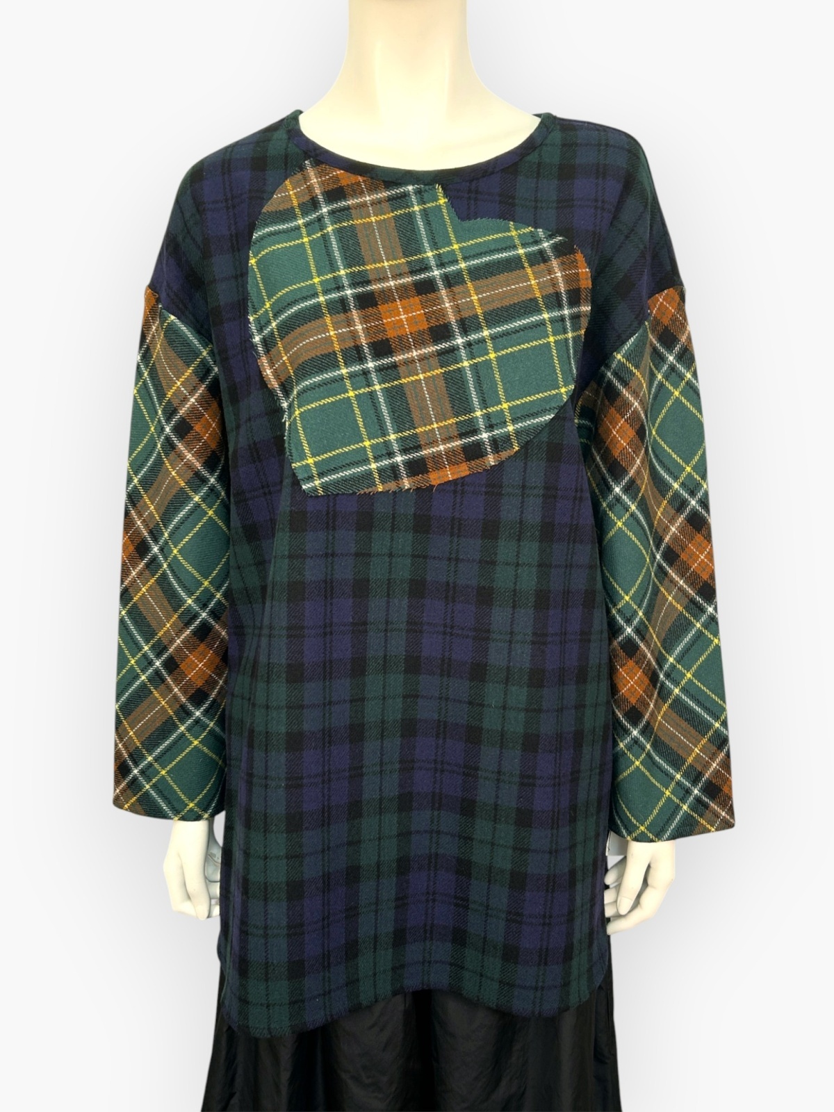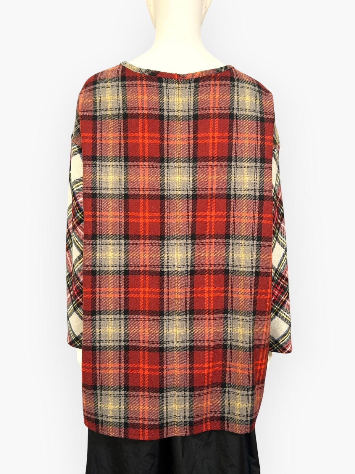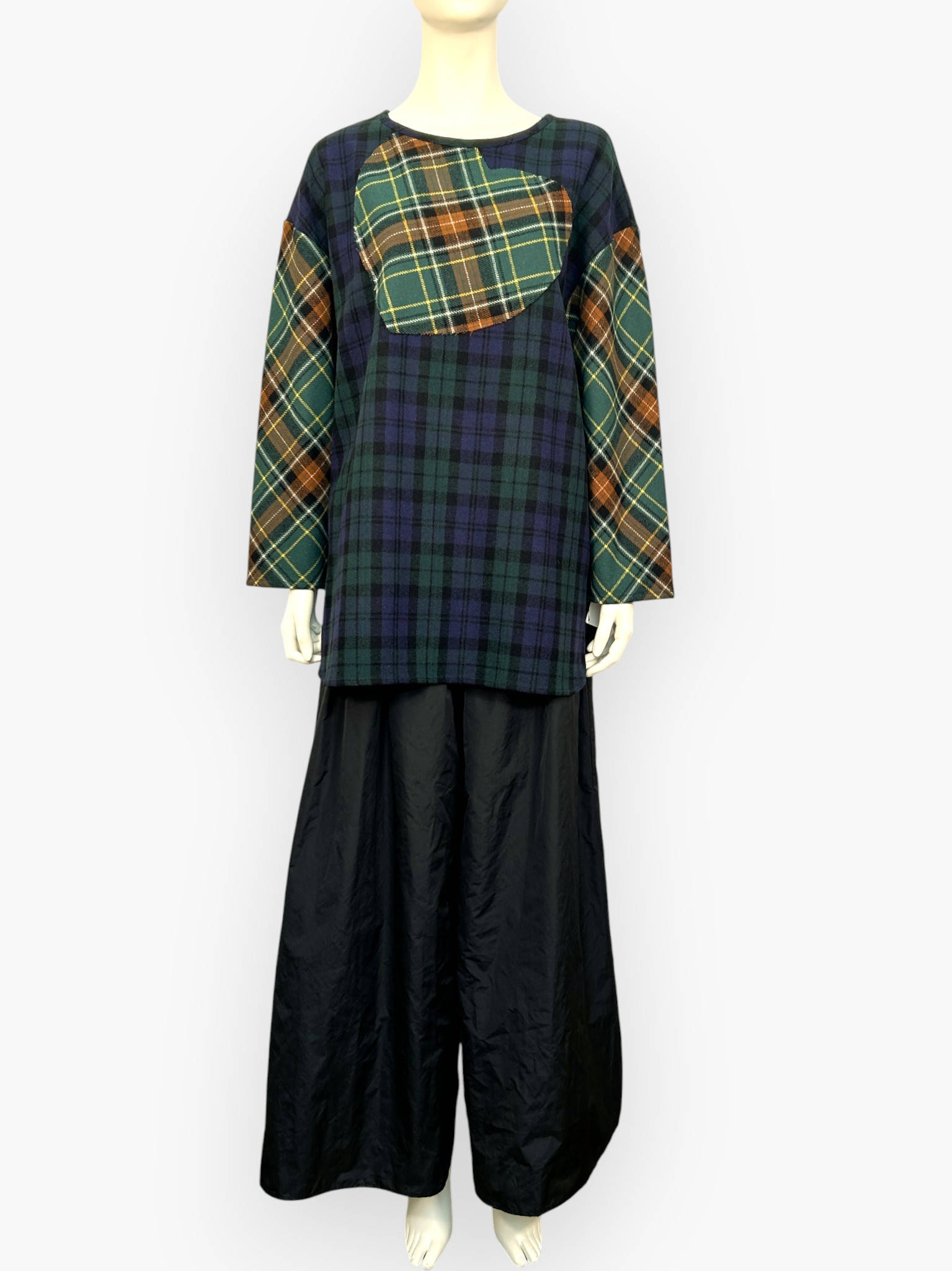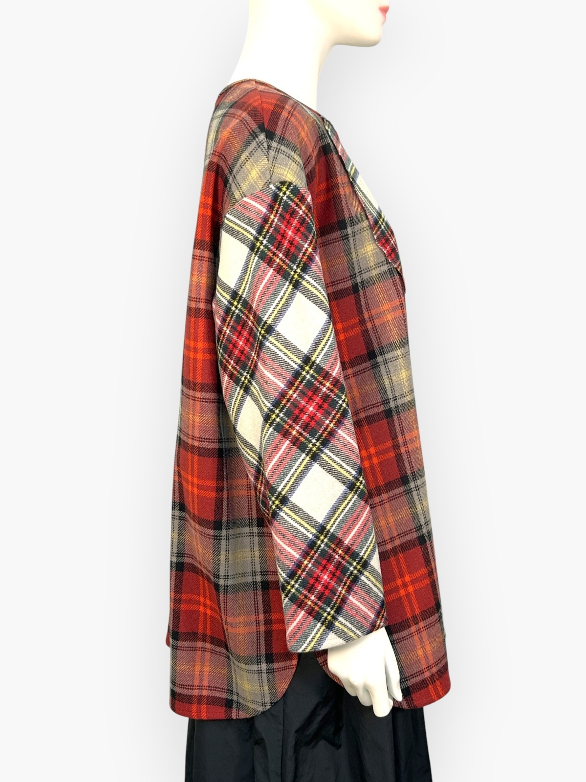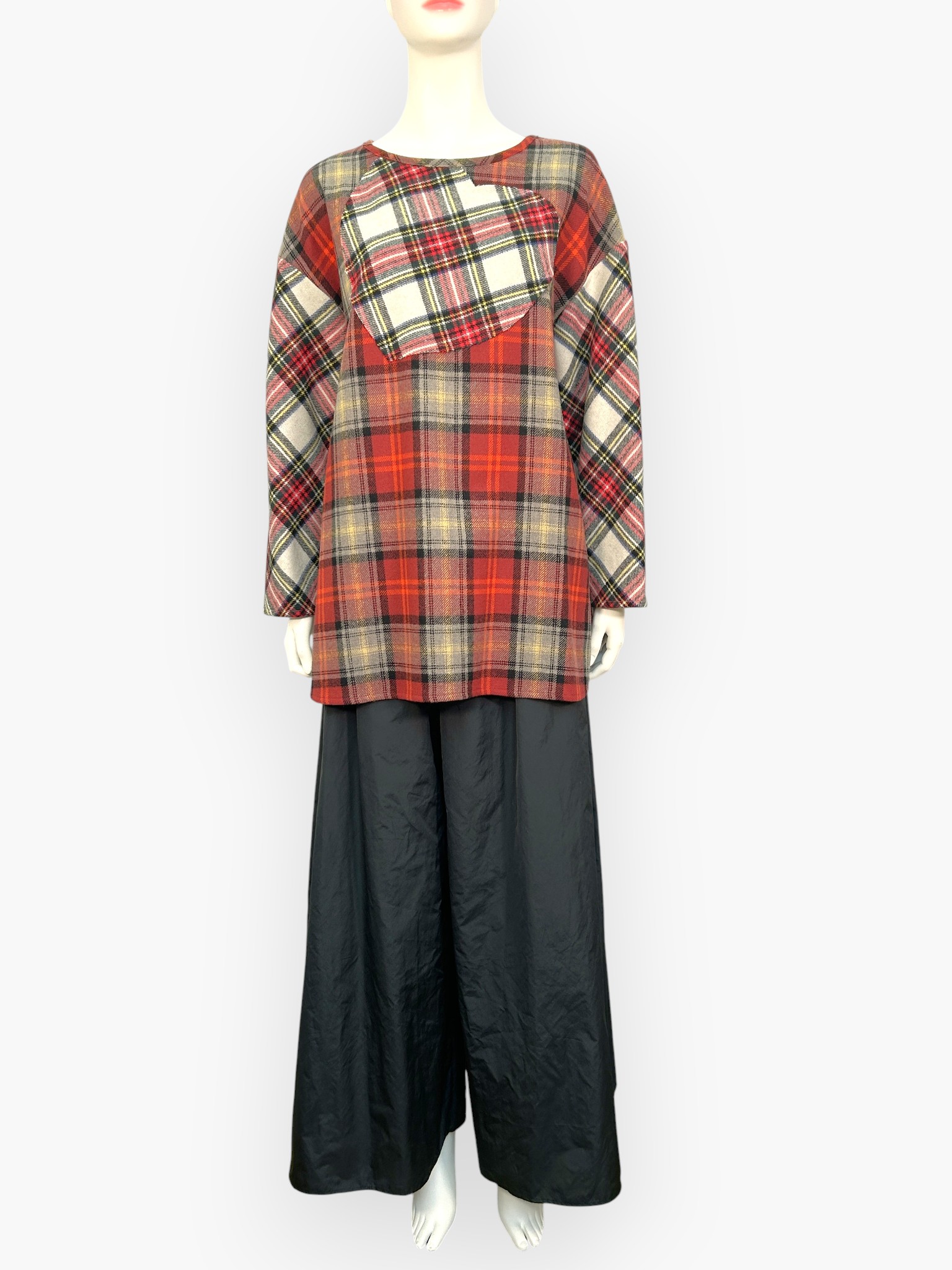 色によって柄の異なる複雑なチェック生地を配色で使用したブラウス。
