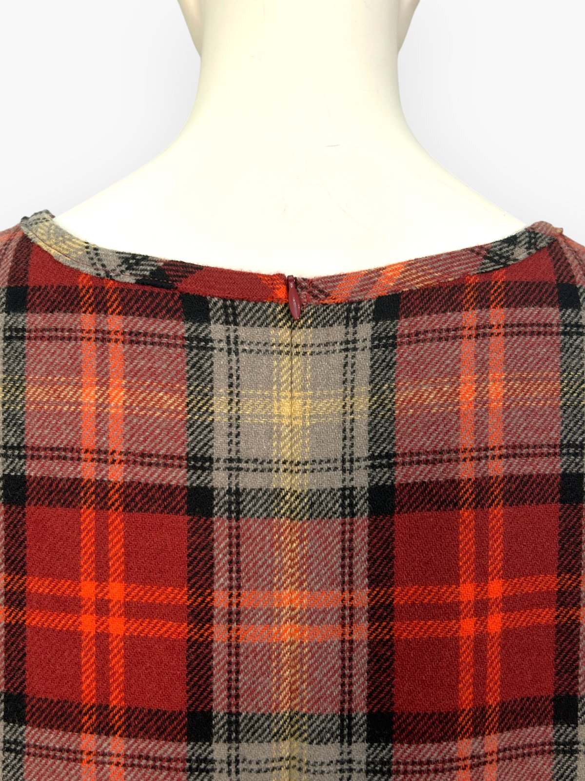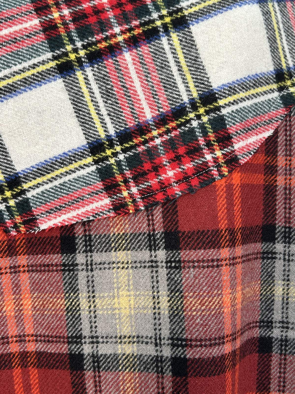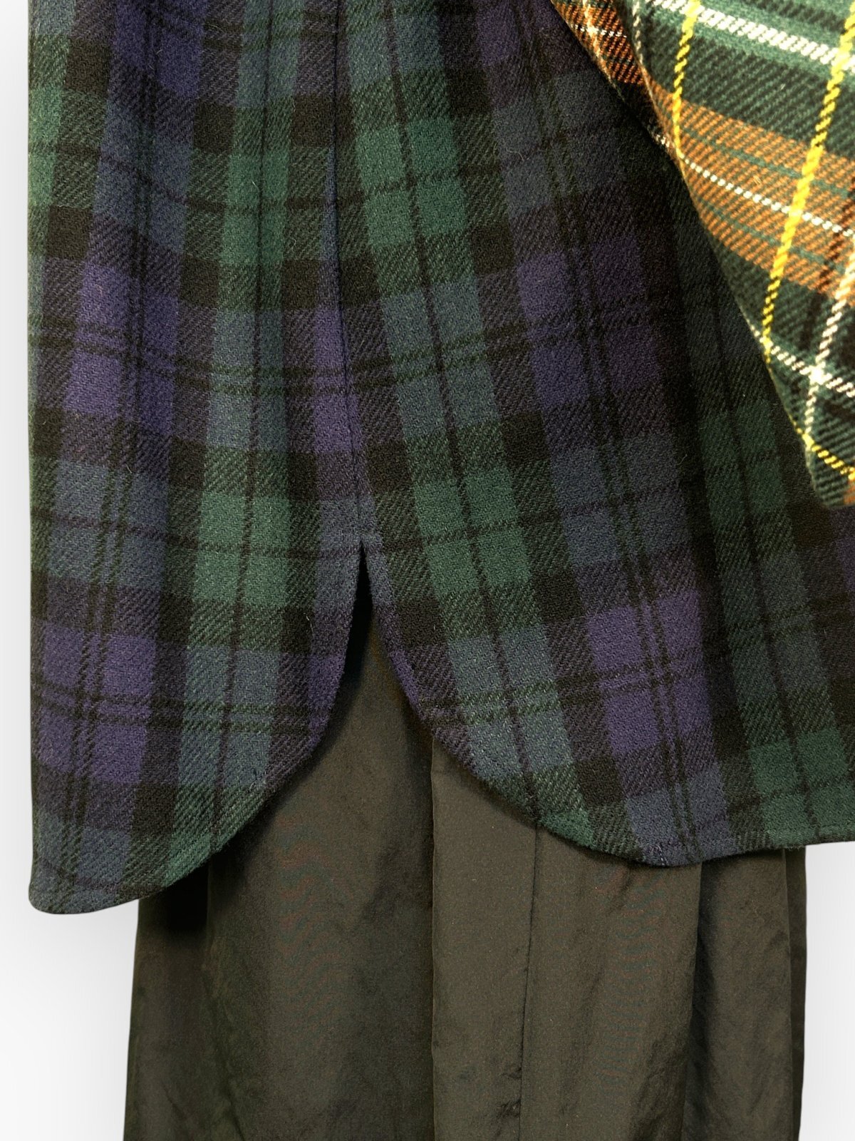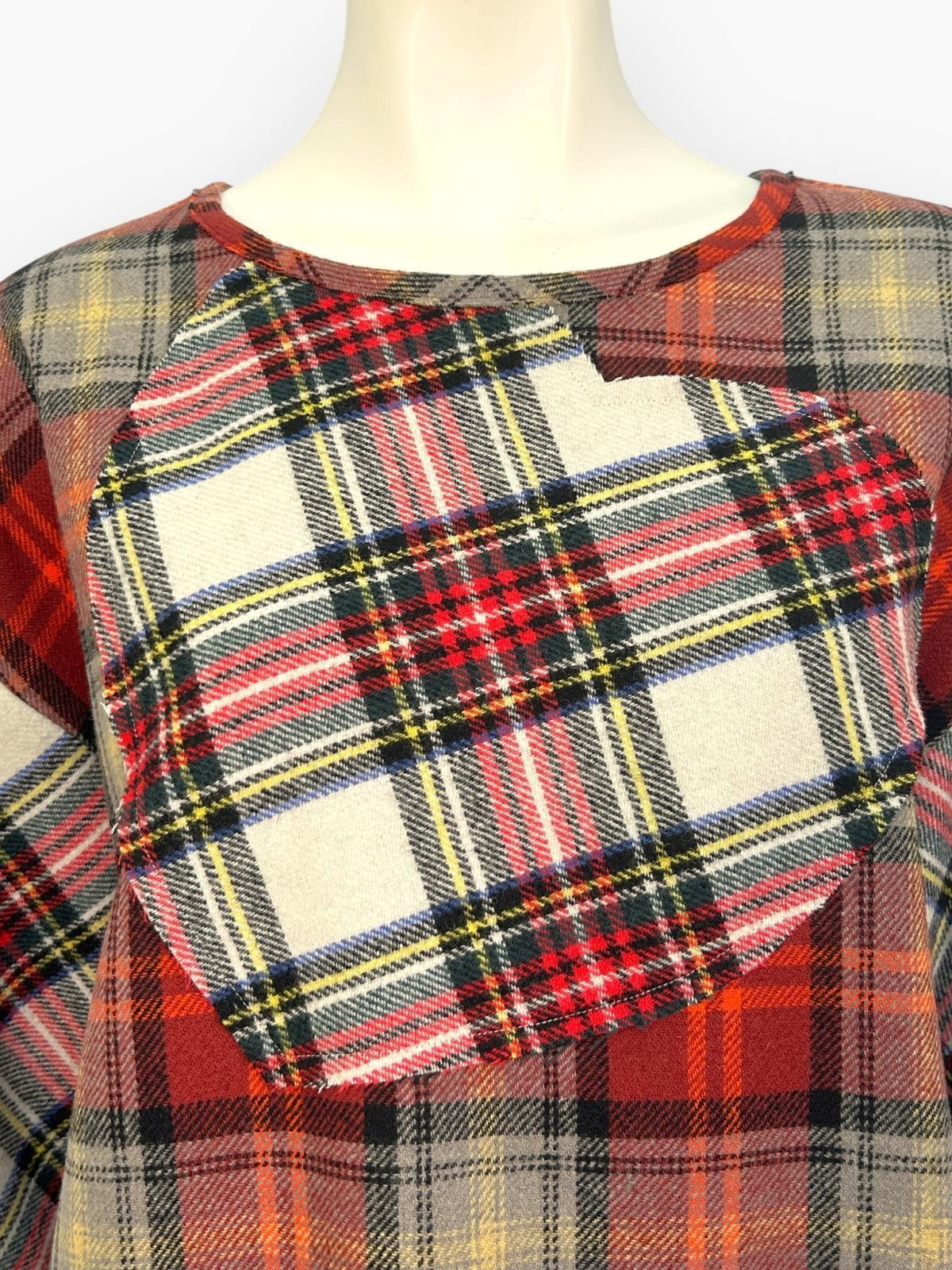 色によって柄の異なる複雑なチェック生地を配色で使用したブラウス。