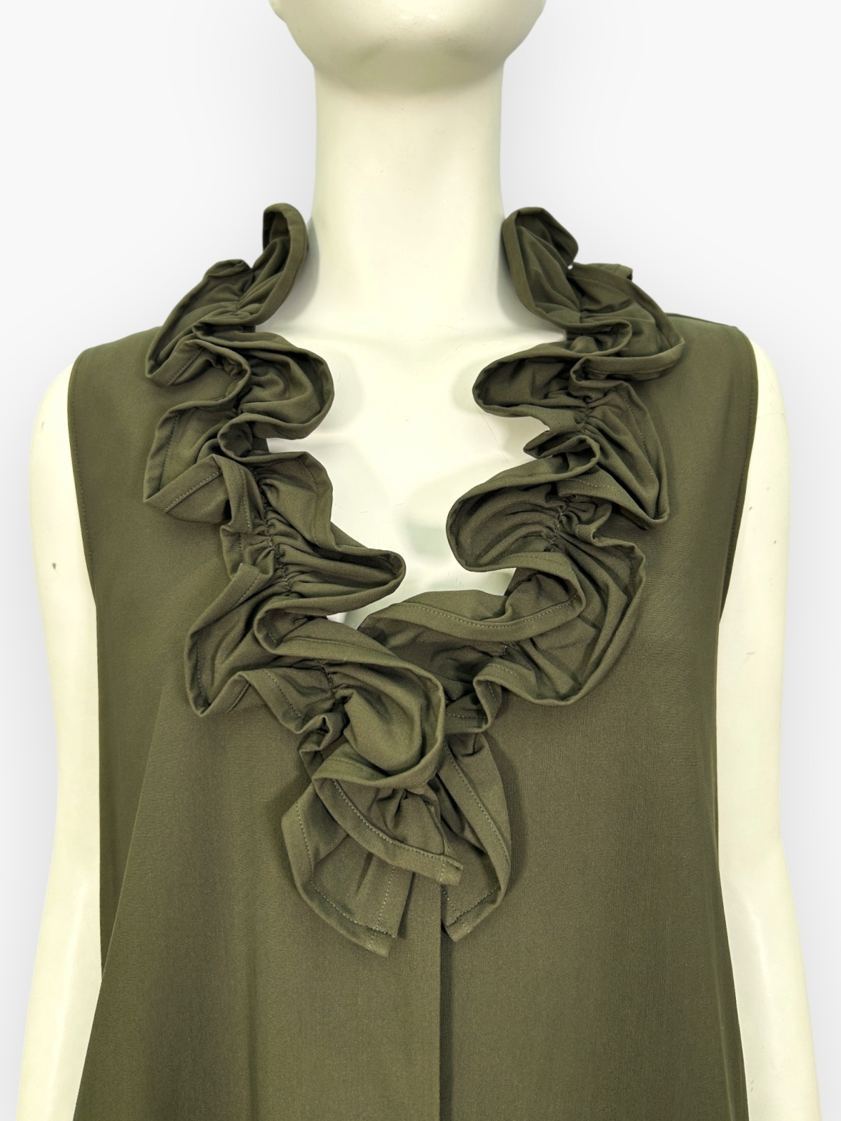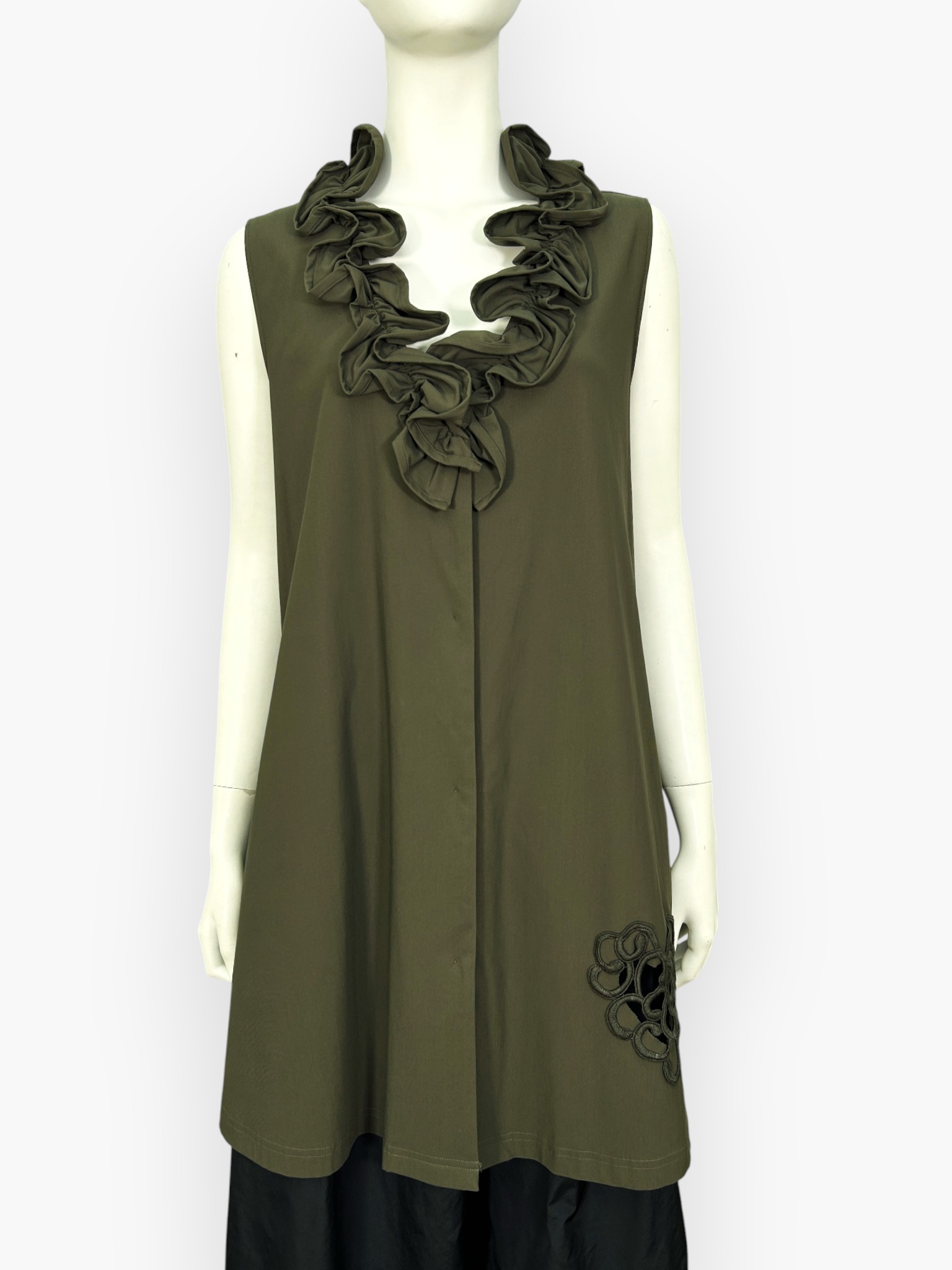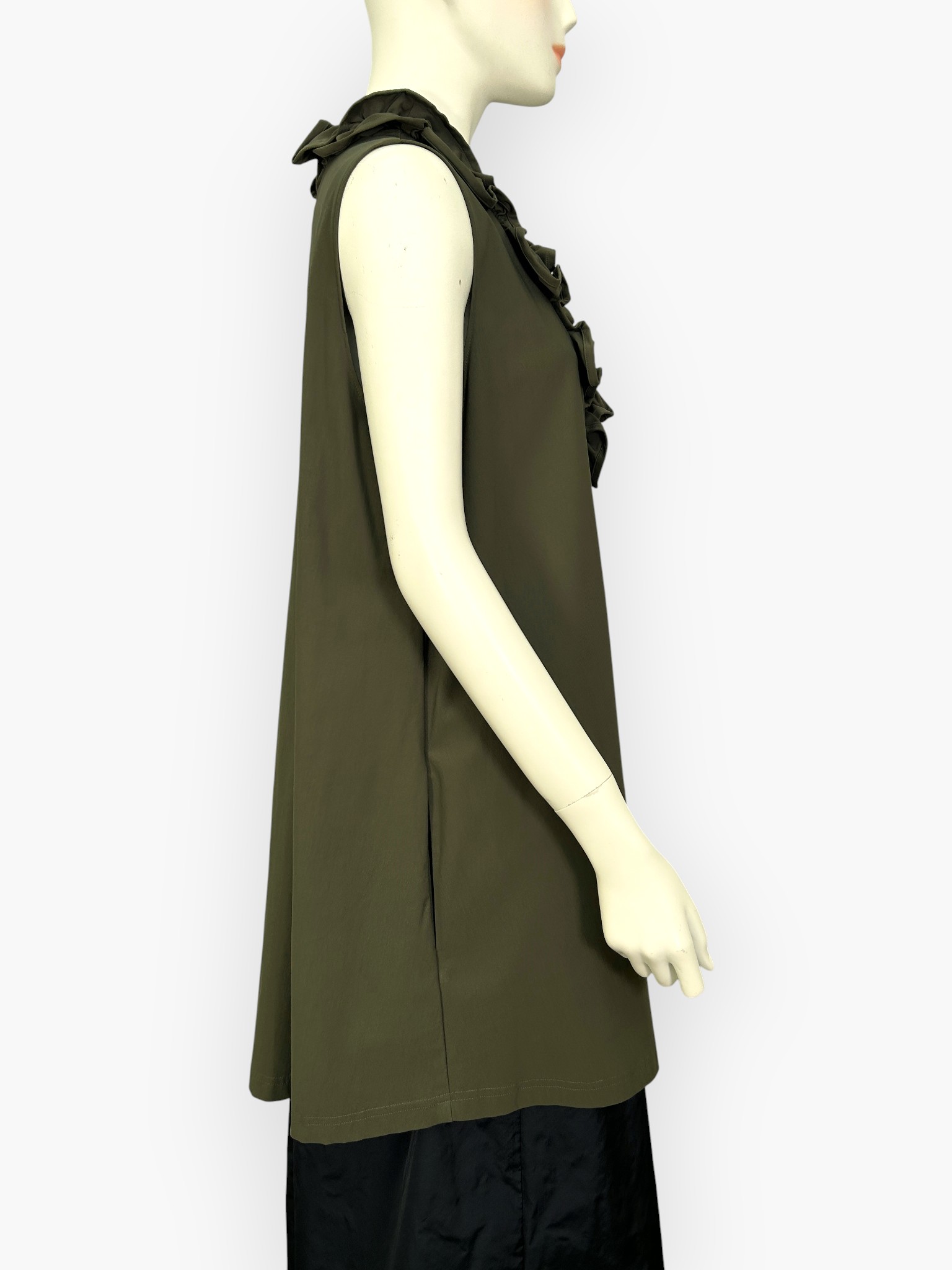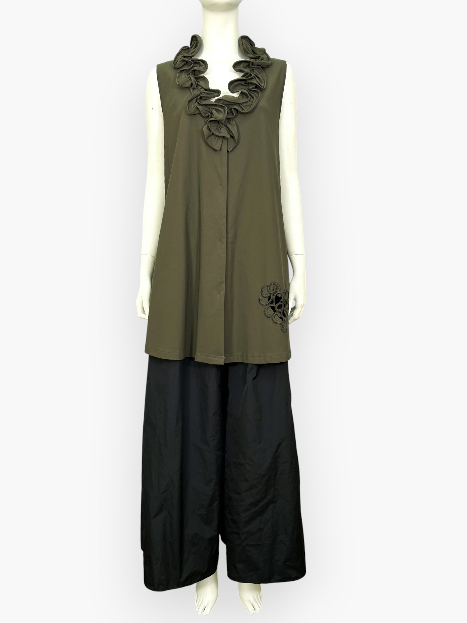 人気のストレッチ素材にフリルやケミカルレースを施したベスト。