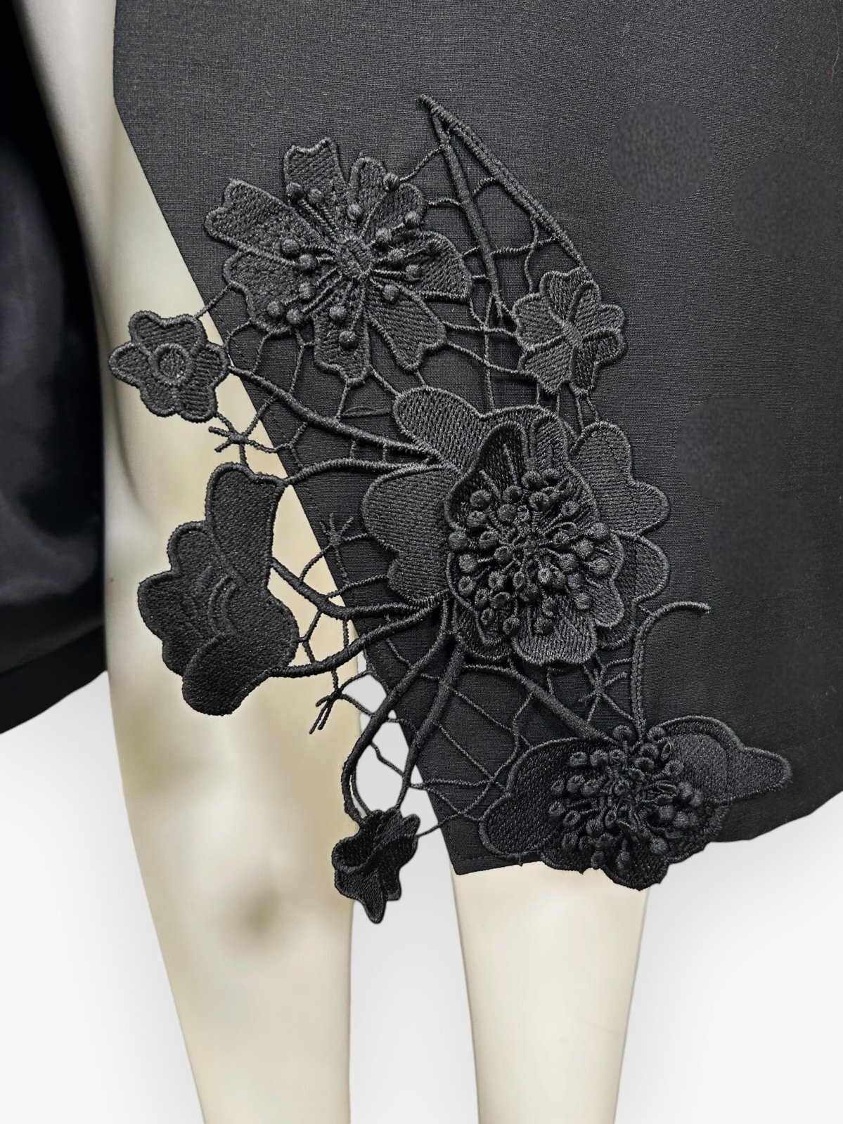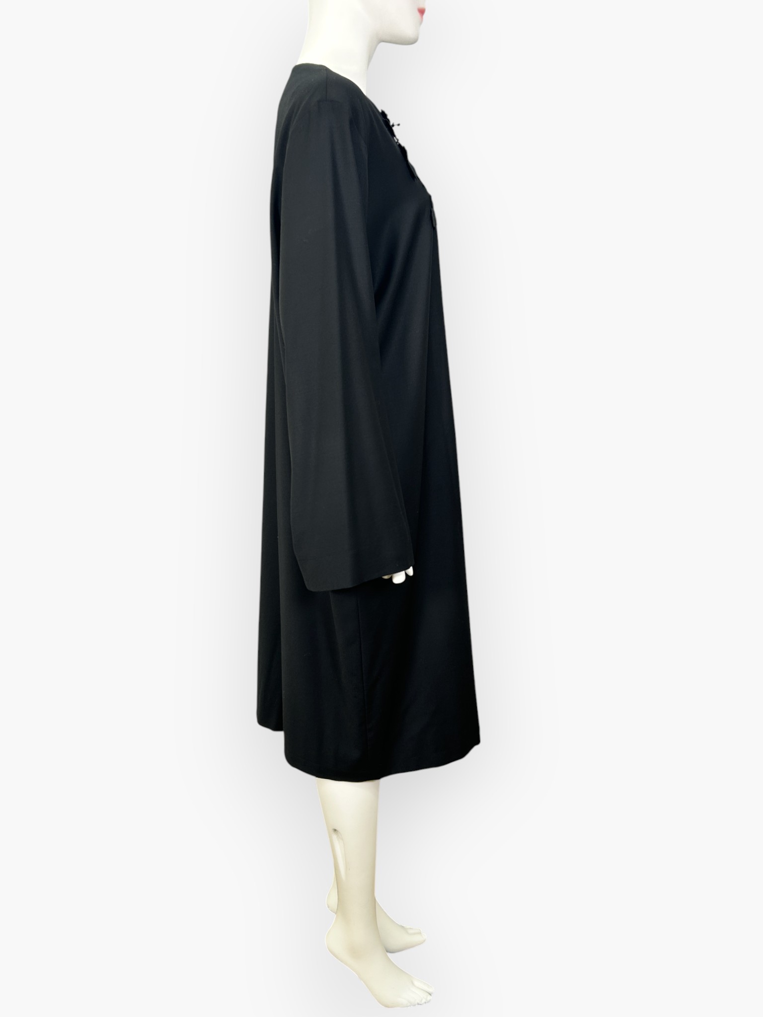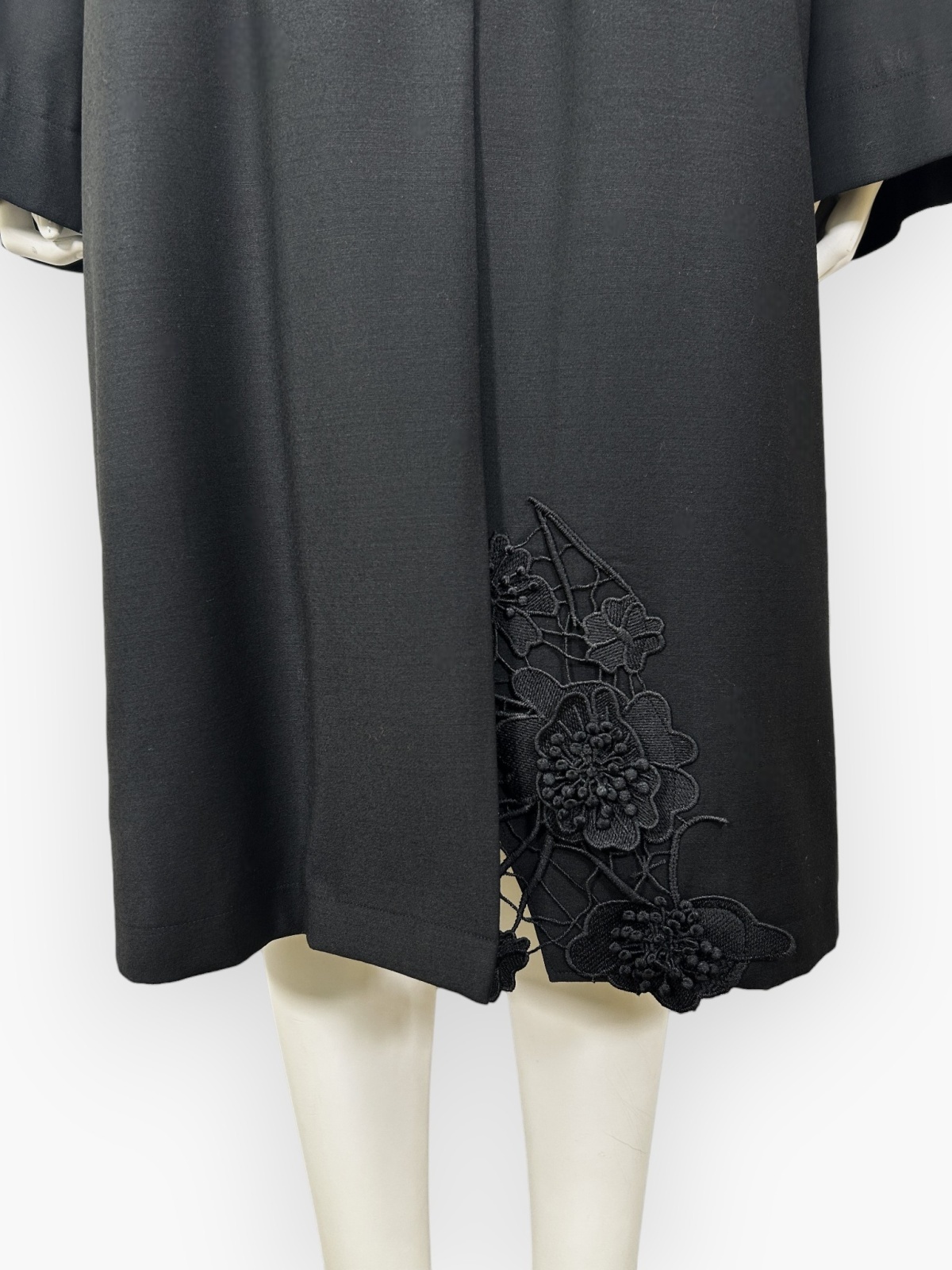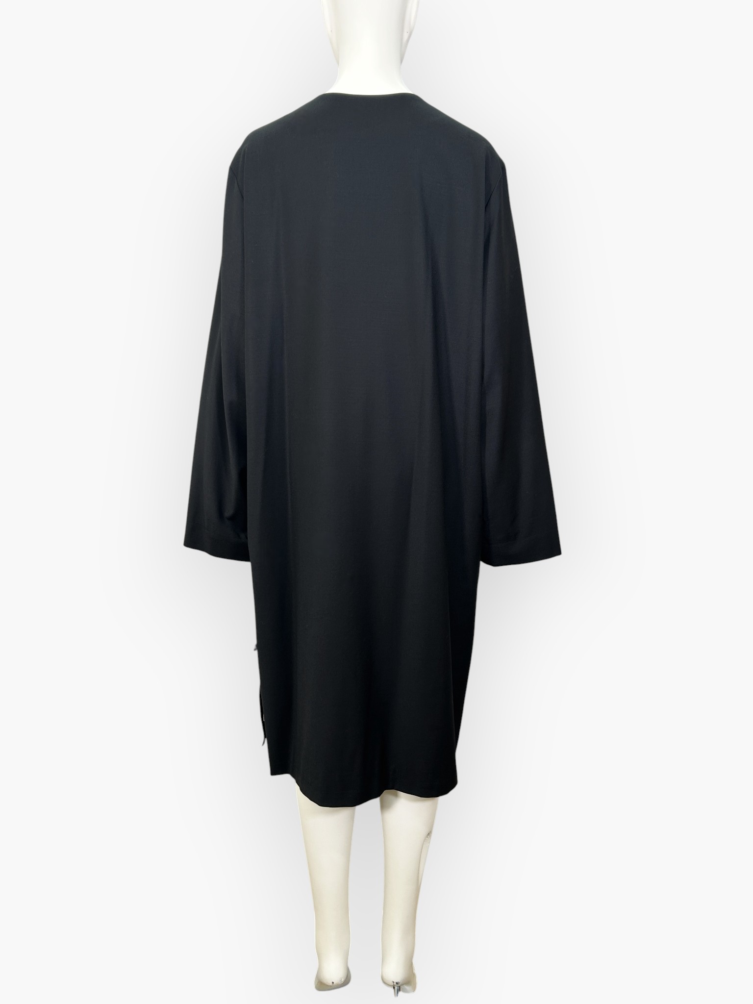モードっぽい雰囲気の生地をたっぷりと使用し仕立てたコクーンシルエットのロングジャケット。