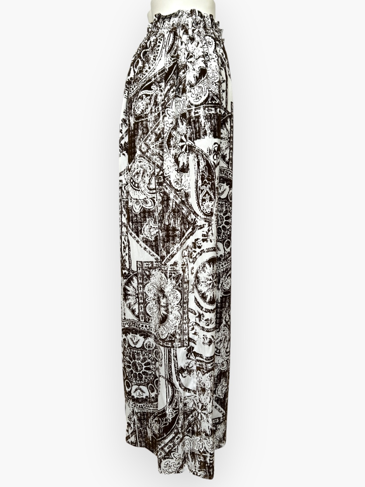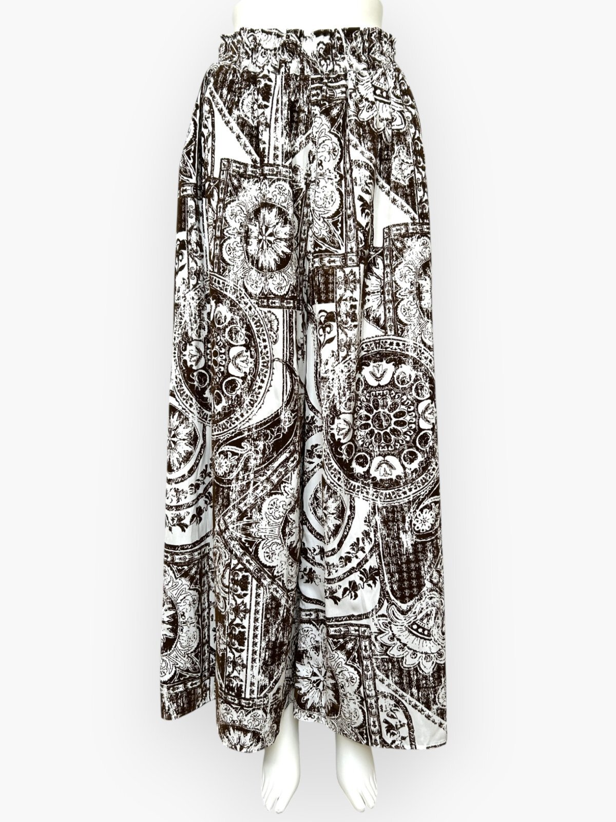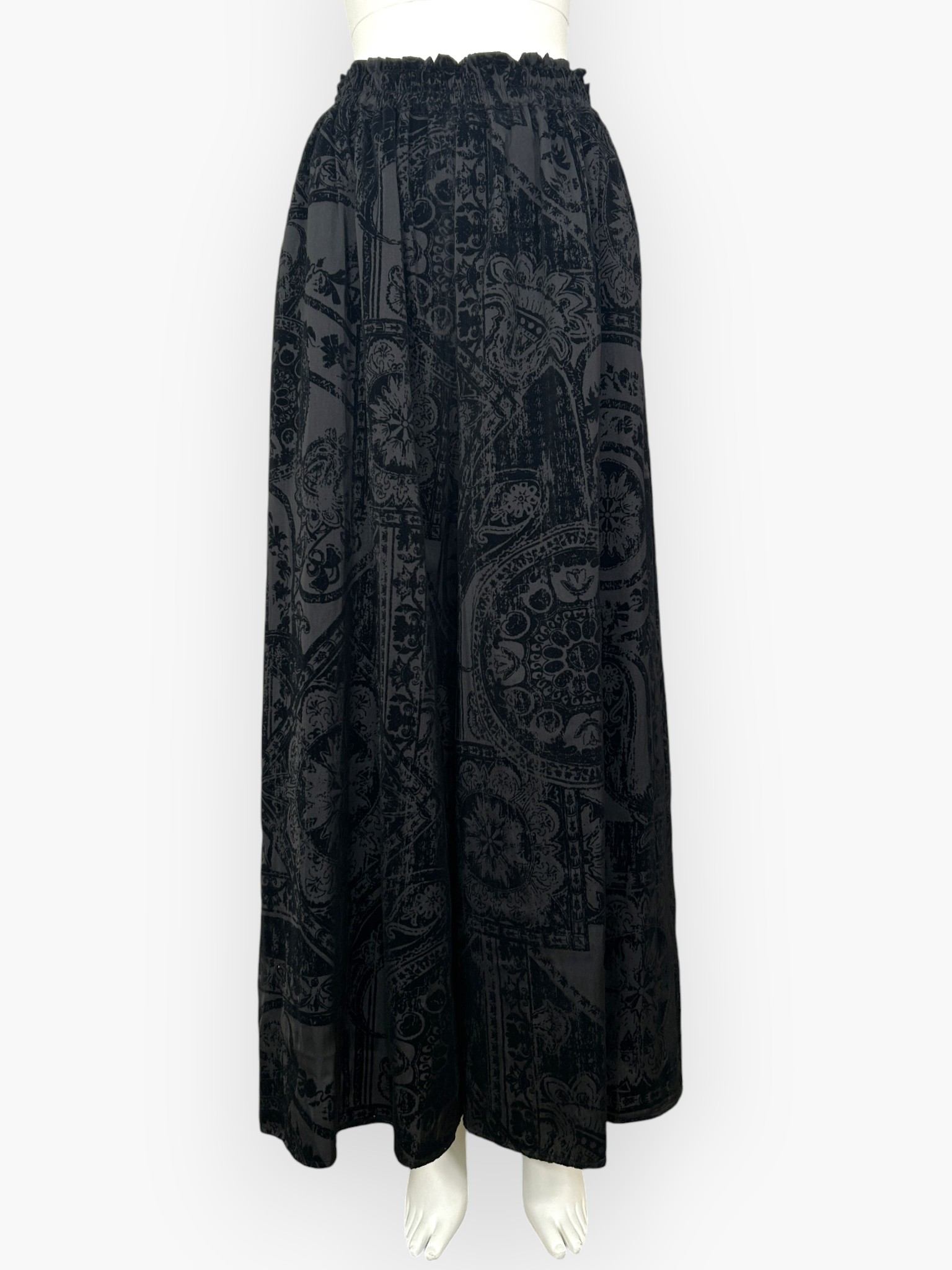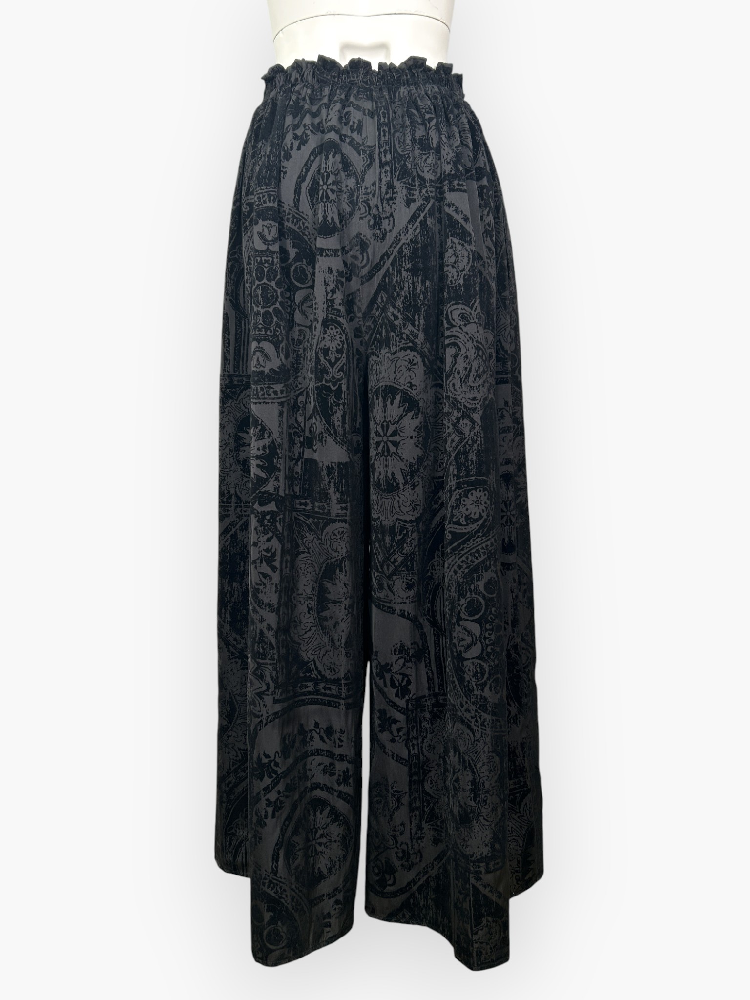 アフリカ モザンビークの民族柄を思わせる個性的な柄をフロッキー加工で大胆に表現したワイドパンツ。