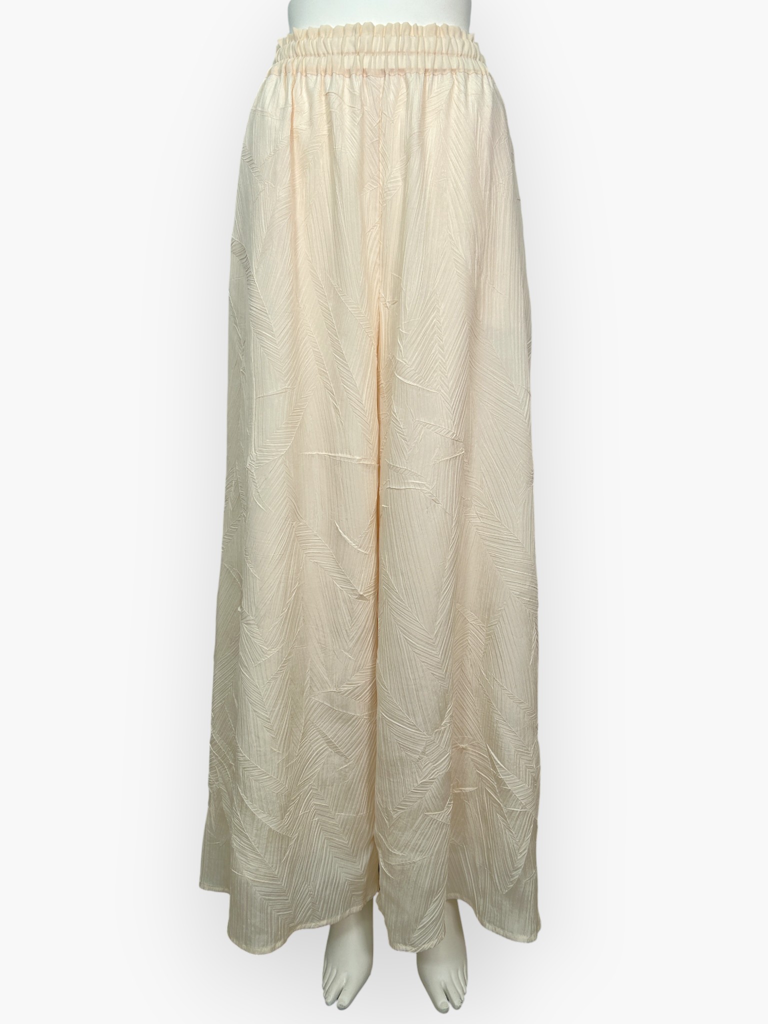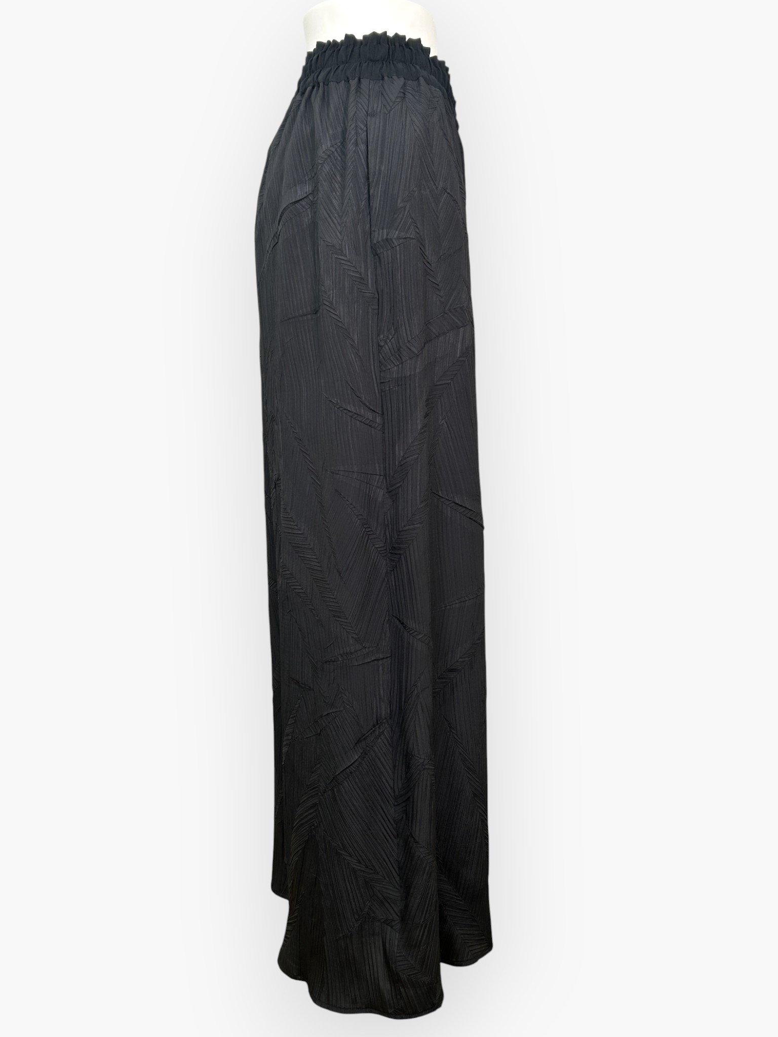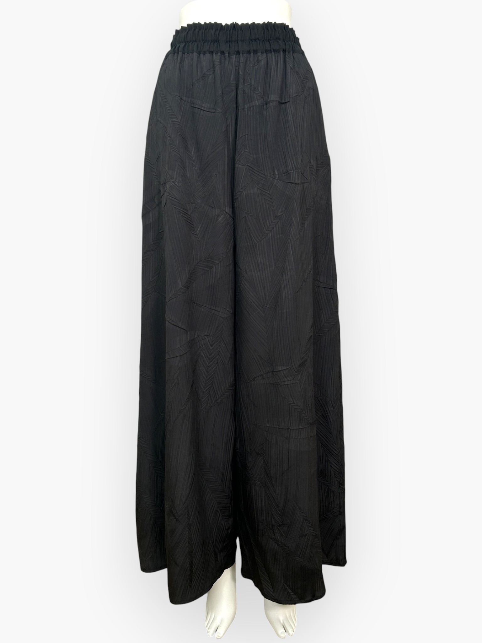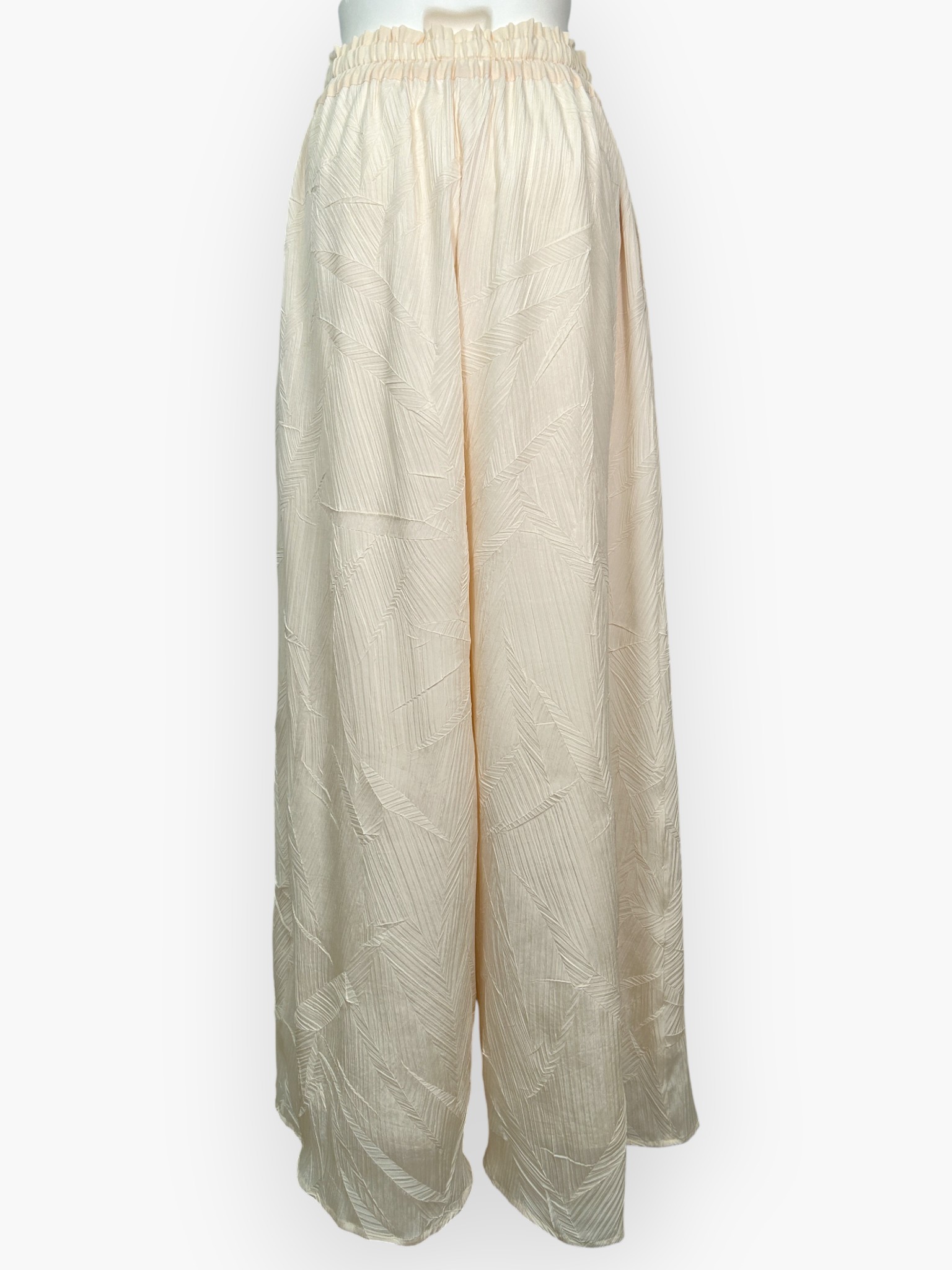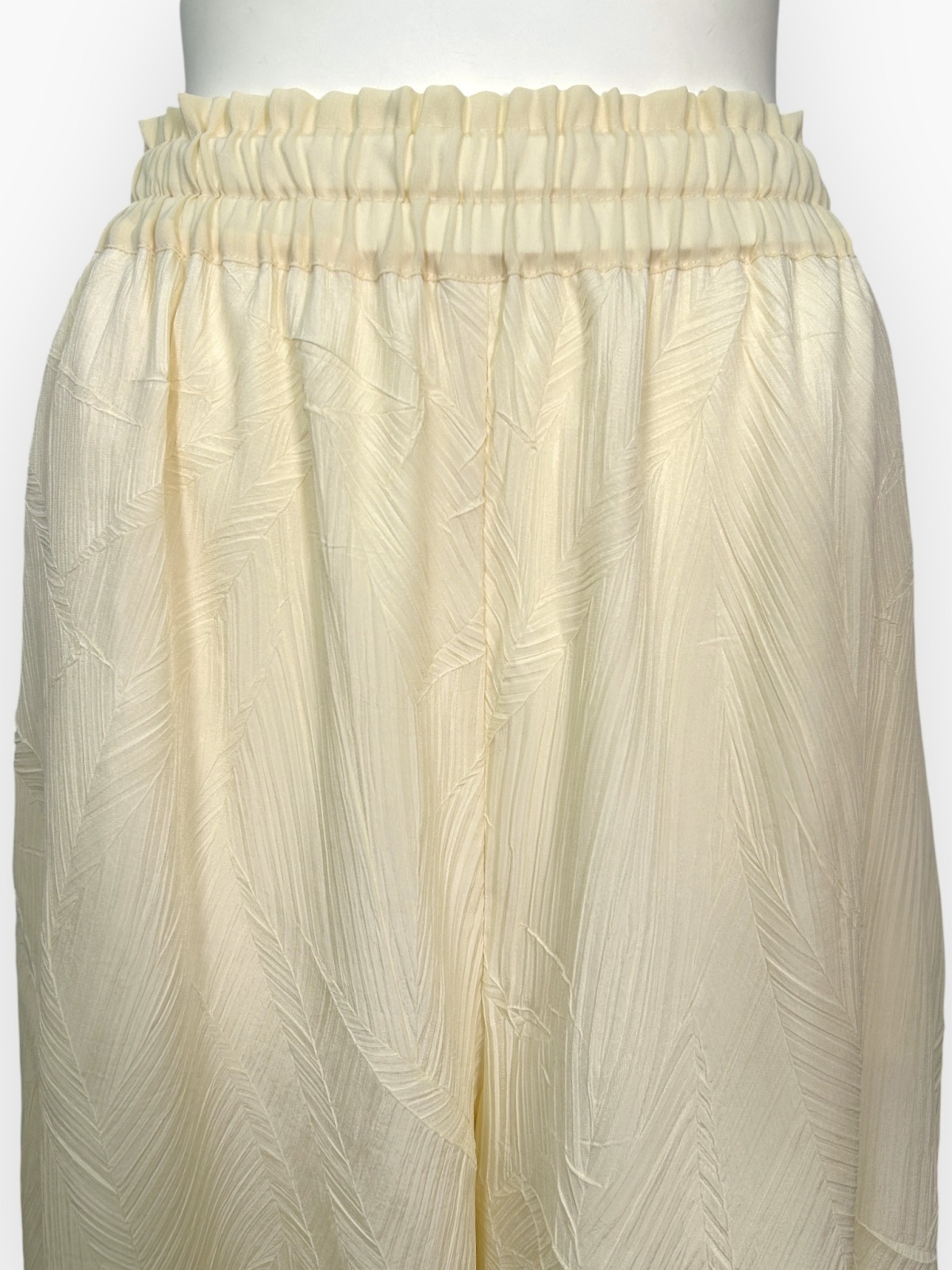 微光沢があるデシン素材に、特殊プリーツ加工のイレギュラーな凹凸感が楽しいワイドパンツ。