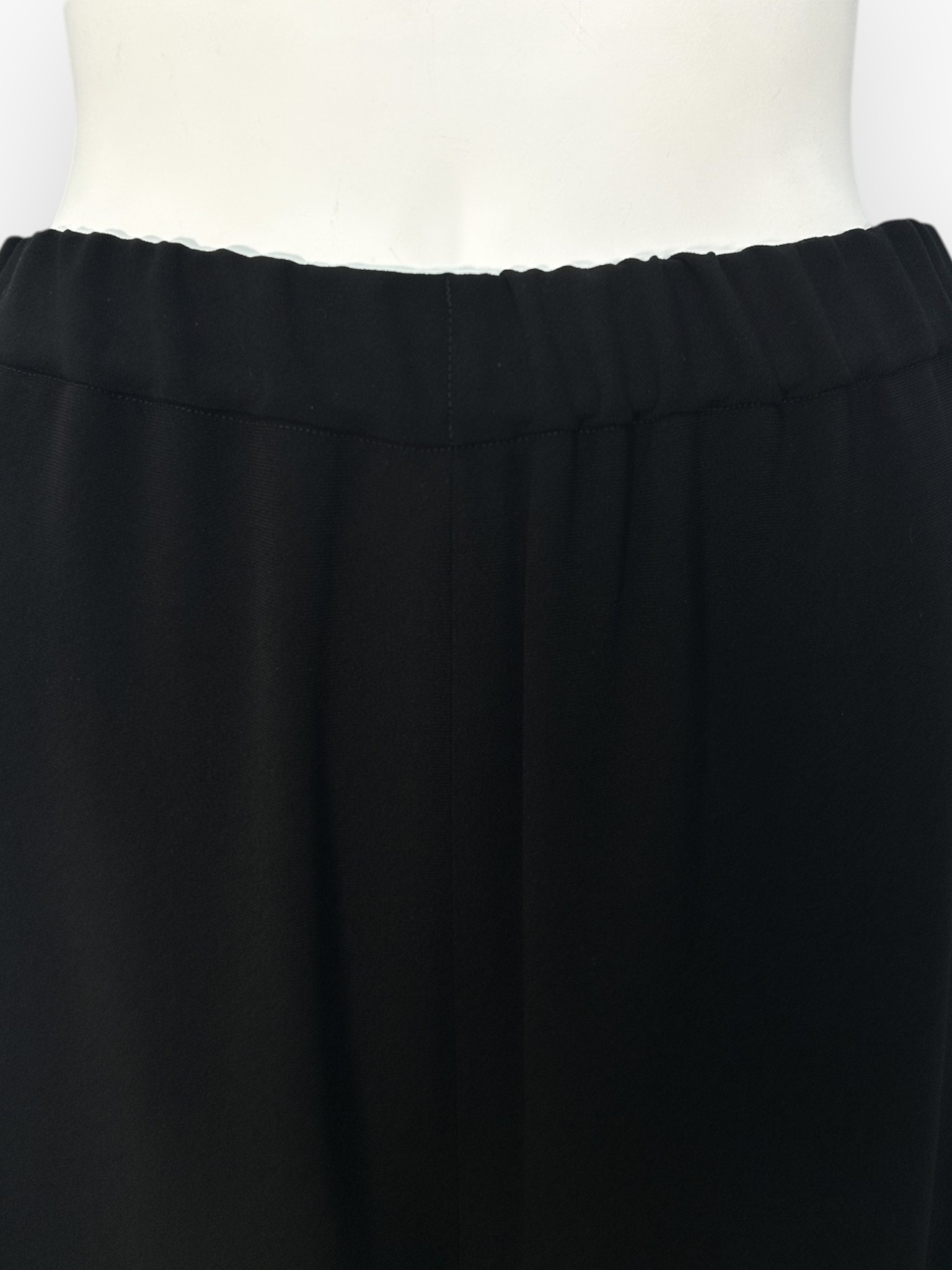 メリハリのある切り替えと脚のラインを拾いにくい落ち感がある生地感でスタイリッシュな雰囲気に。
