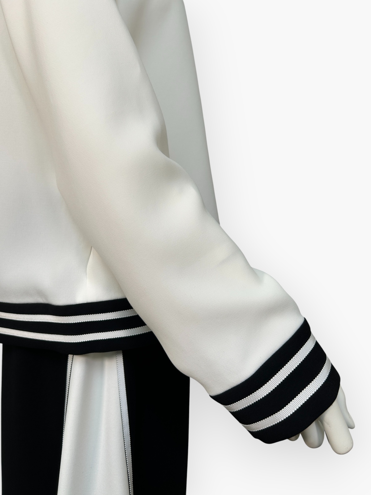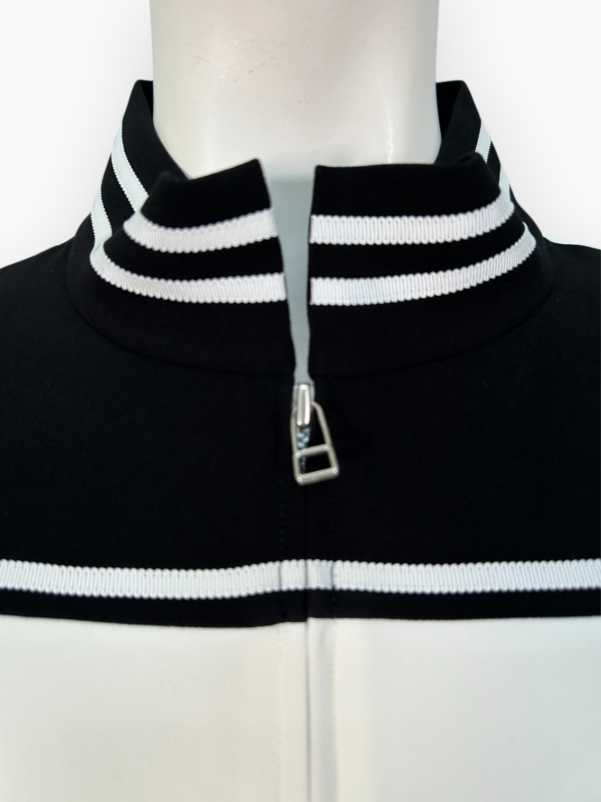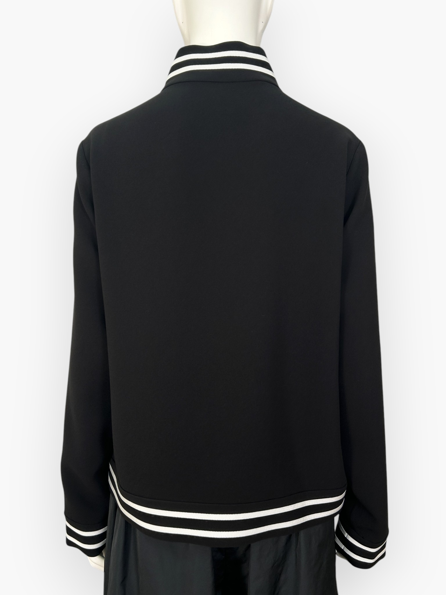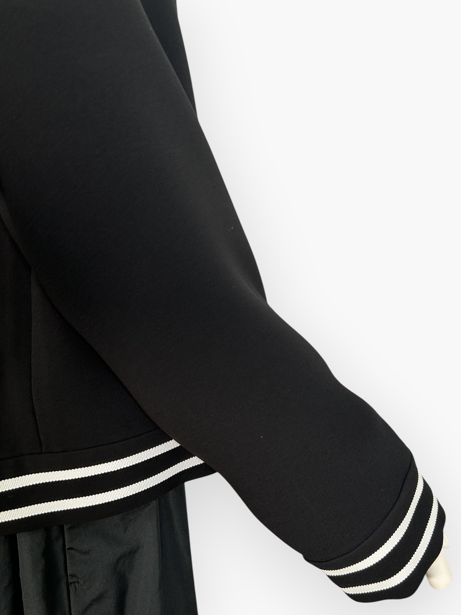 白黒の配色と差し色ラインでマリン風に仕上げたブルゾン。