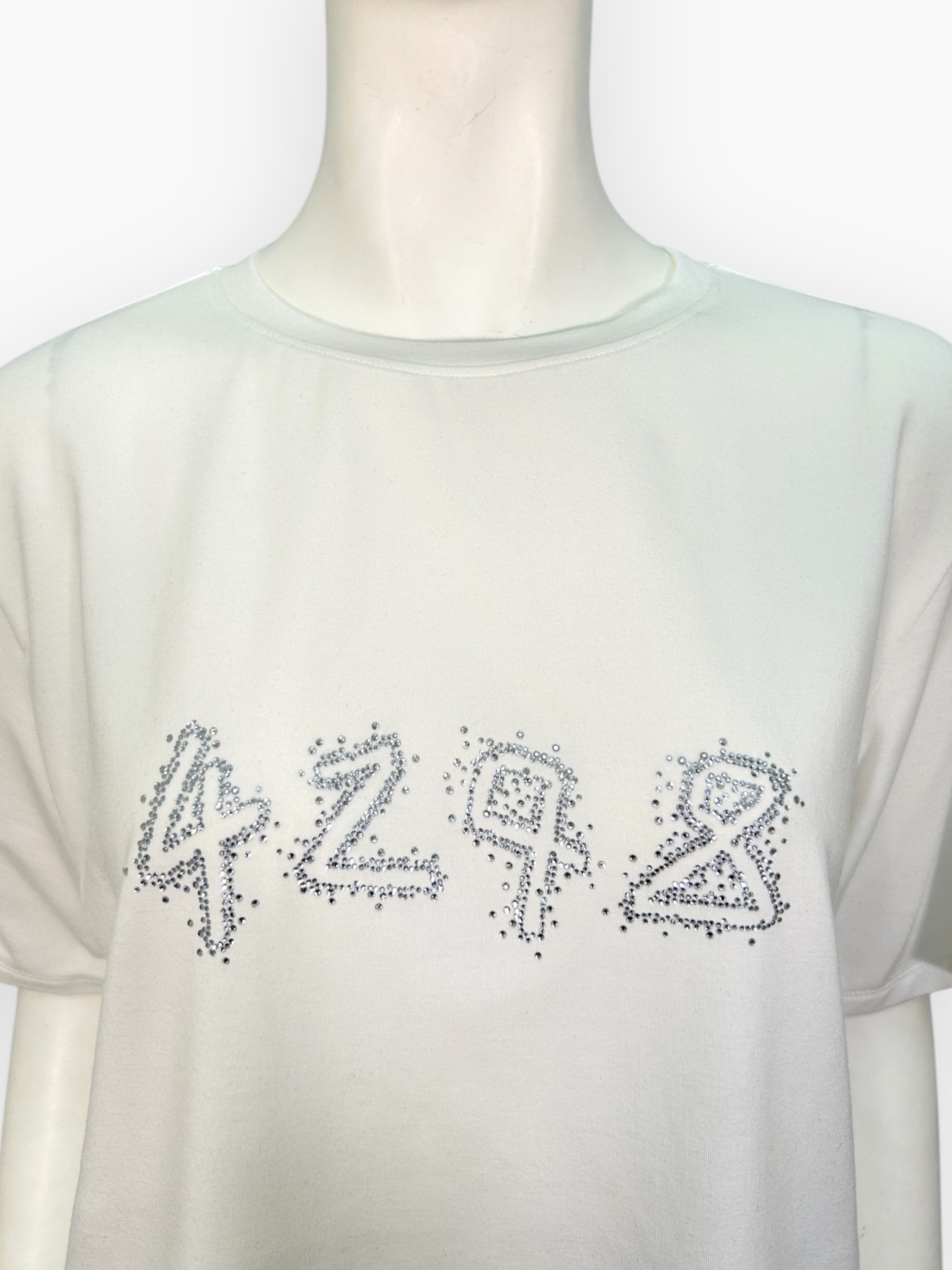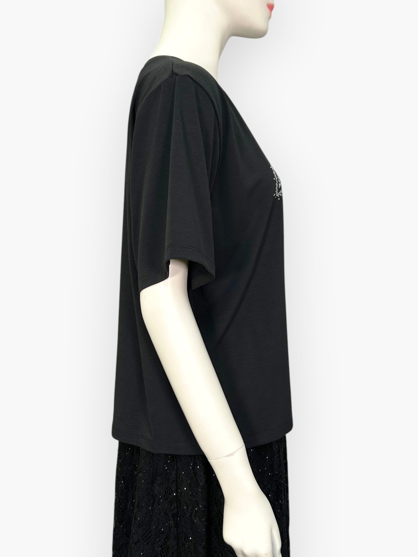 コンパクトな着丈と品よく輝くラインストーンが魅力で、幅広いコーディネートに合わせやすい万能アイテムです。