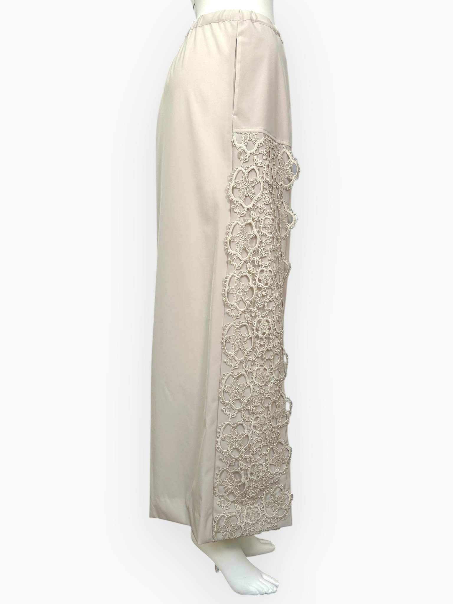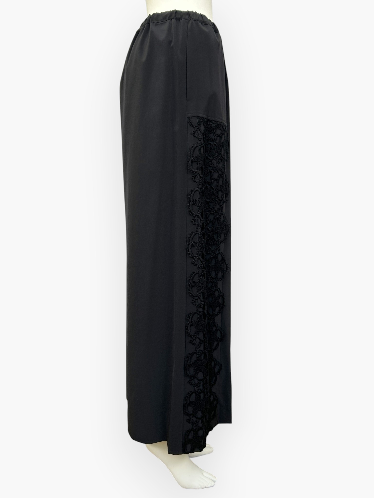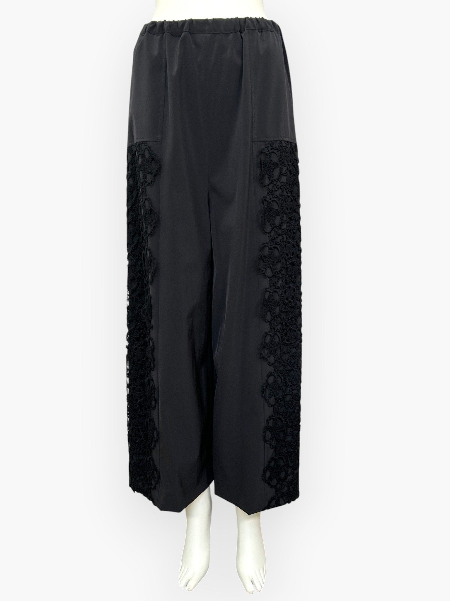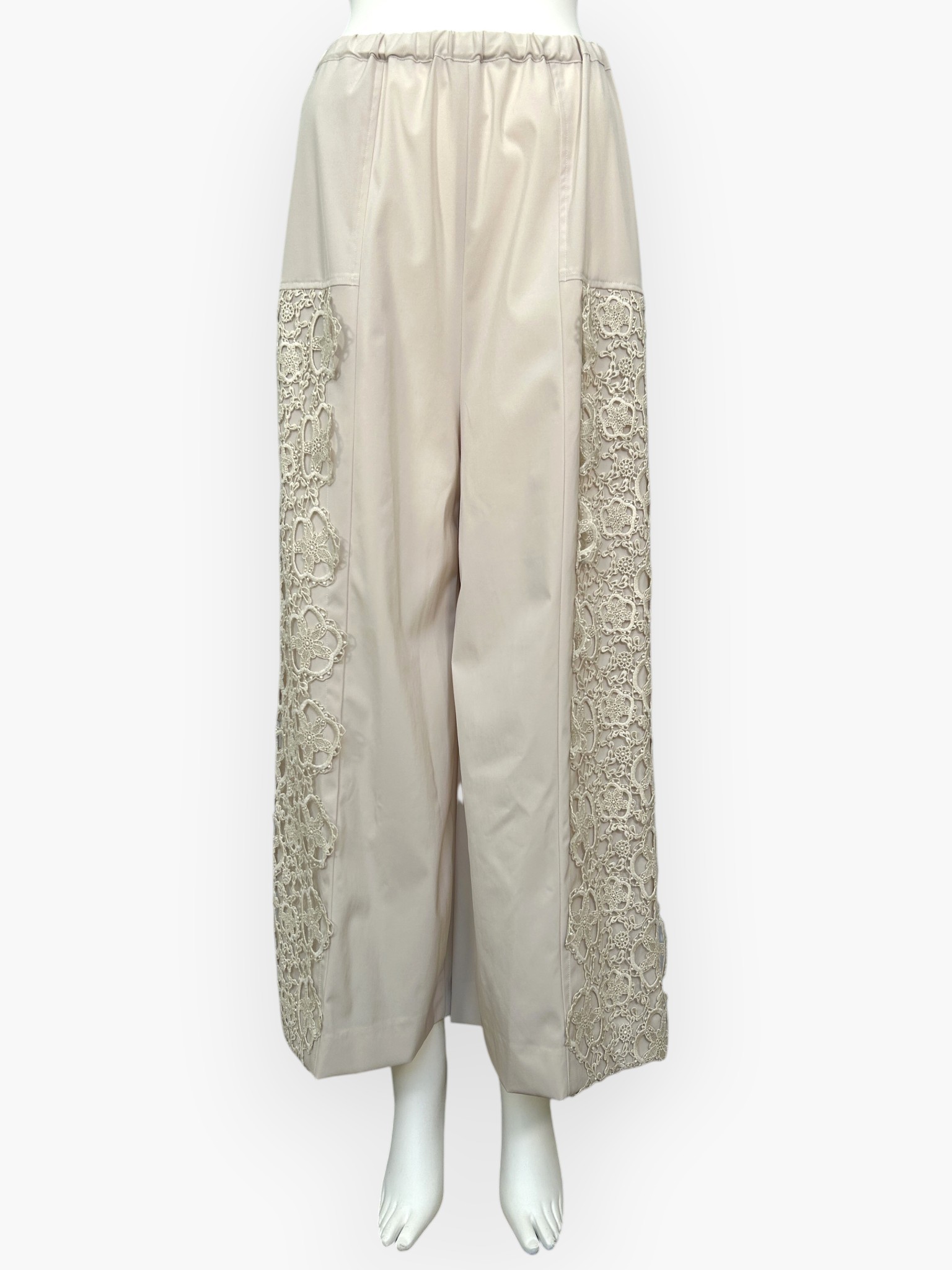 両サイドに施された存在感のあるレースが目を引く、カジュアルエレガントなワイドパンツ。