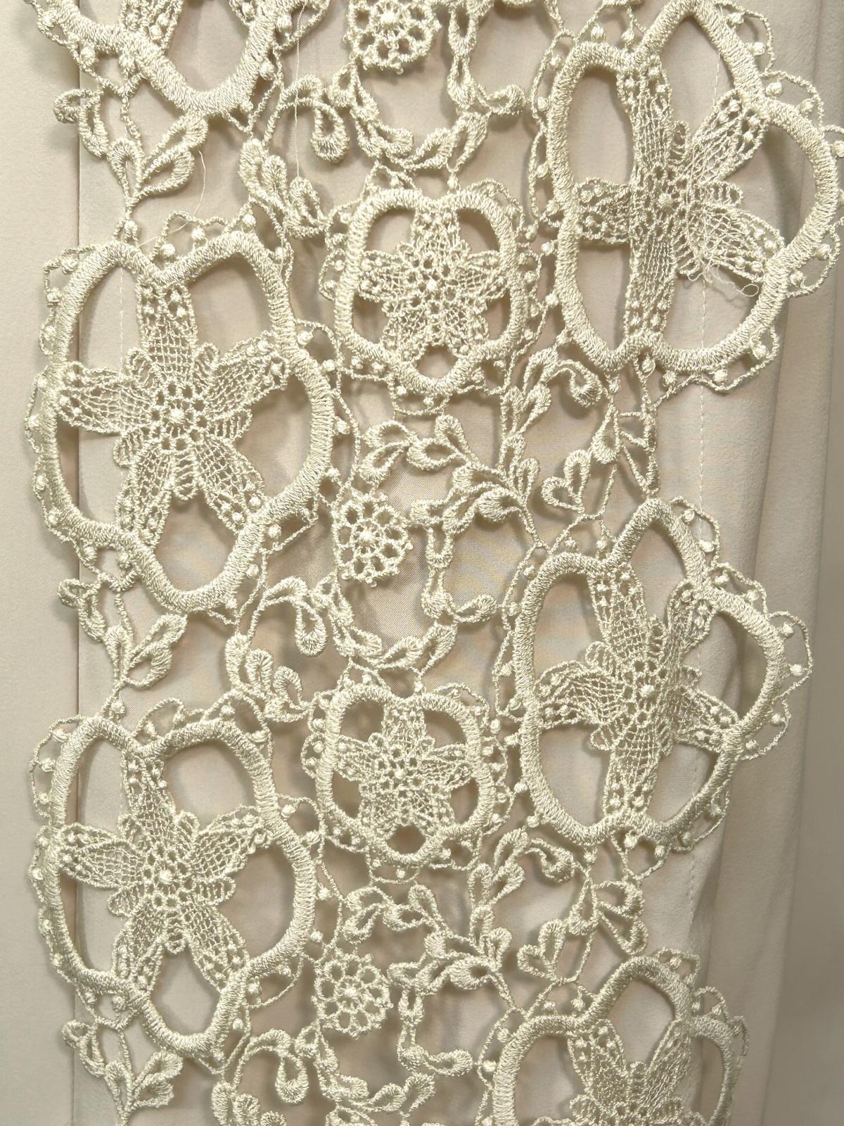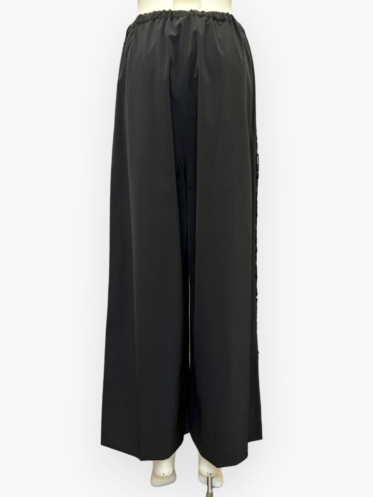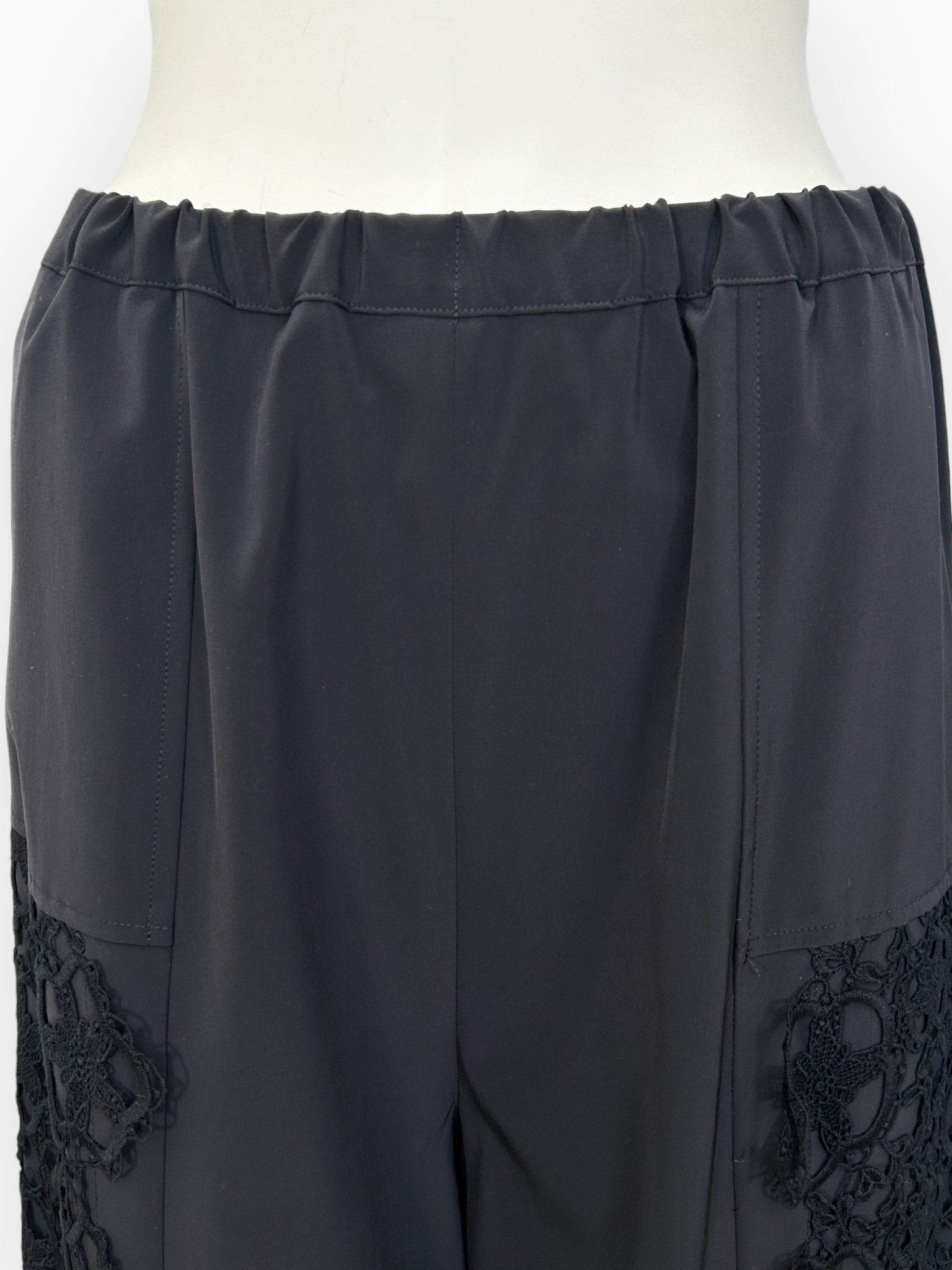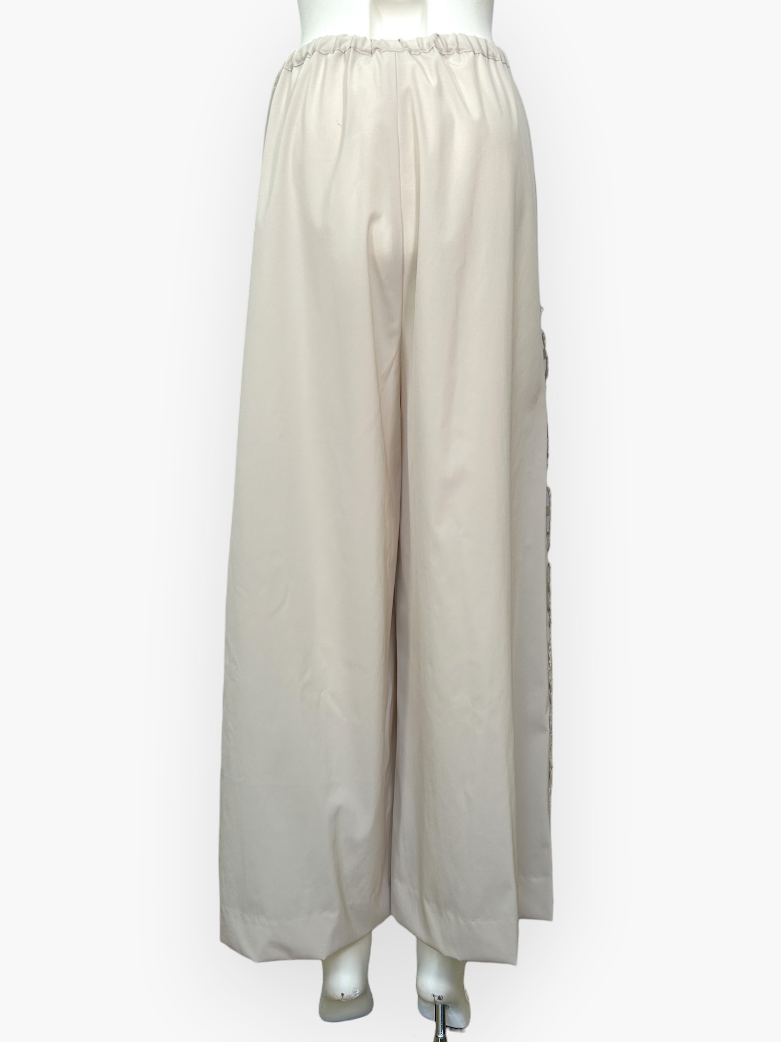 両サイドに施された存在感のあるレースが目を引く、カジュアルエレガントなワイドパンツ。