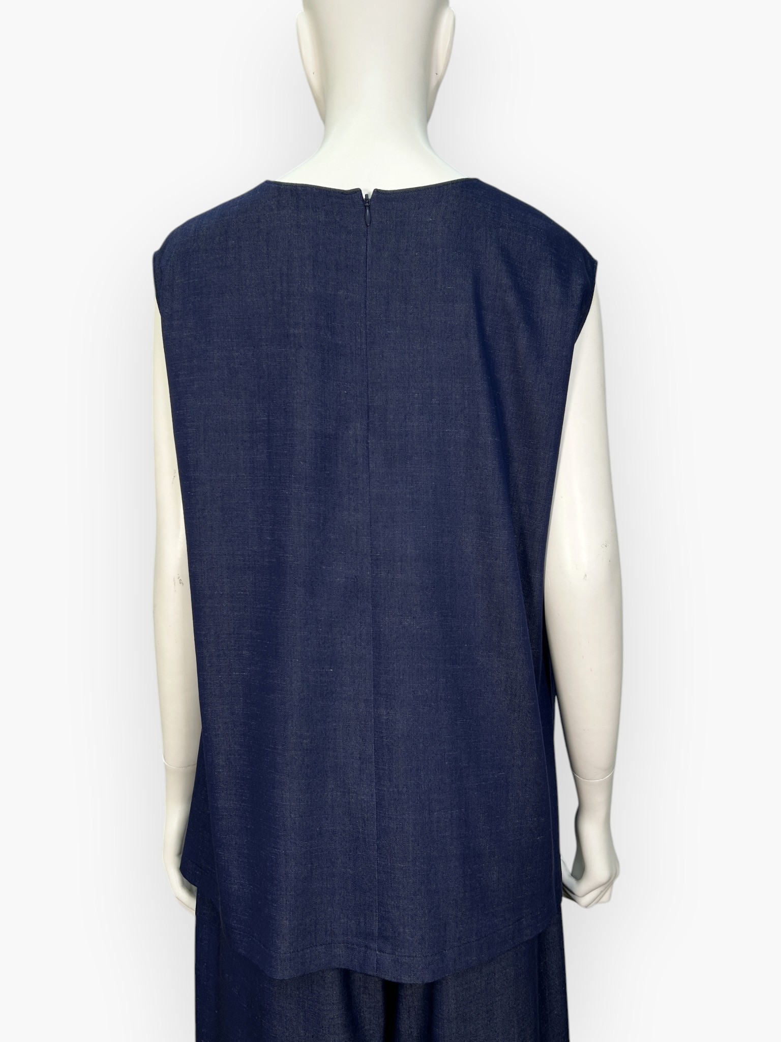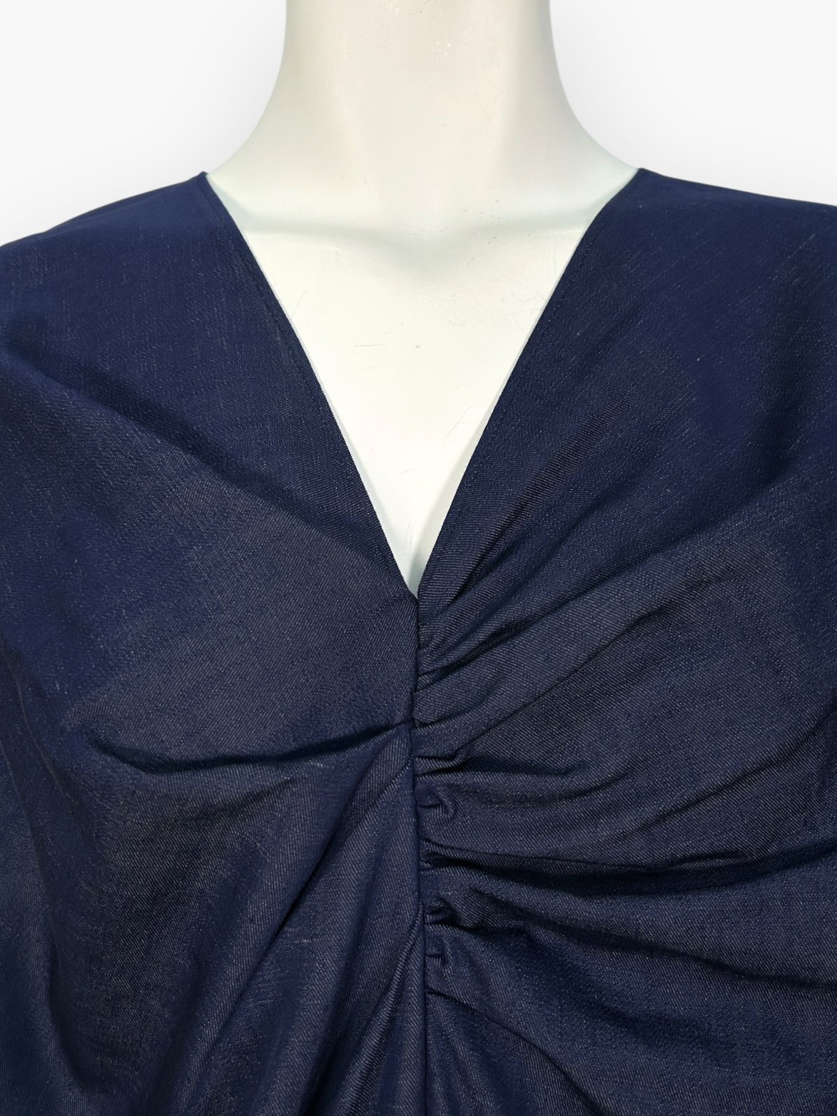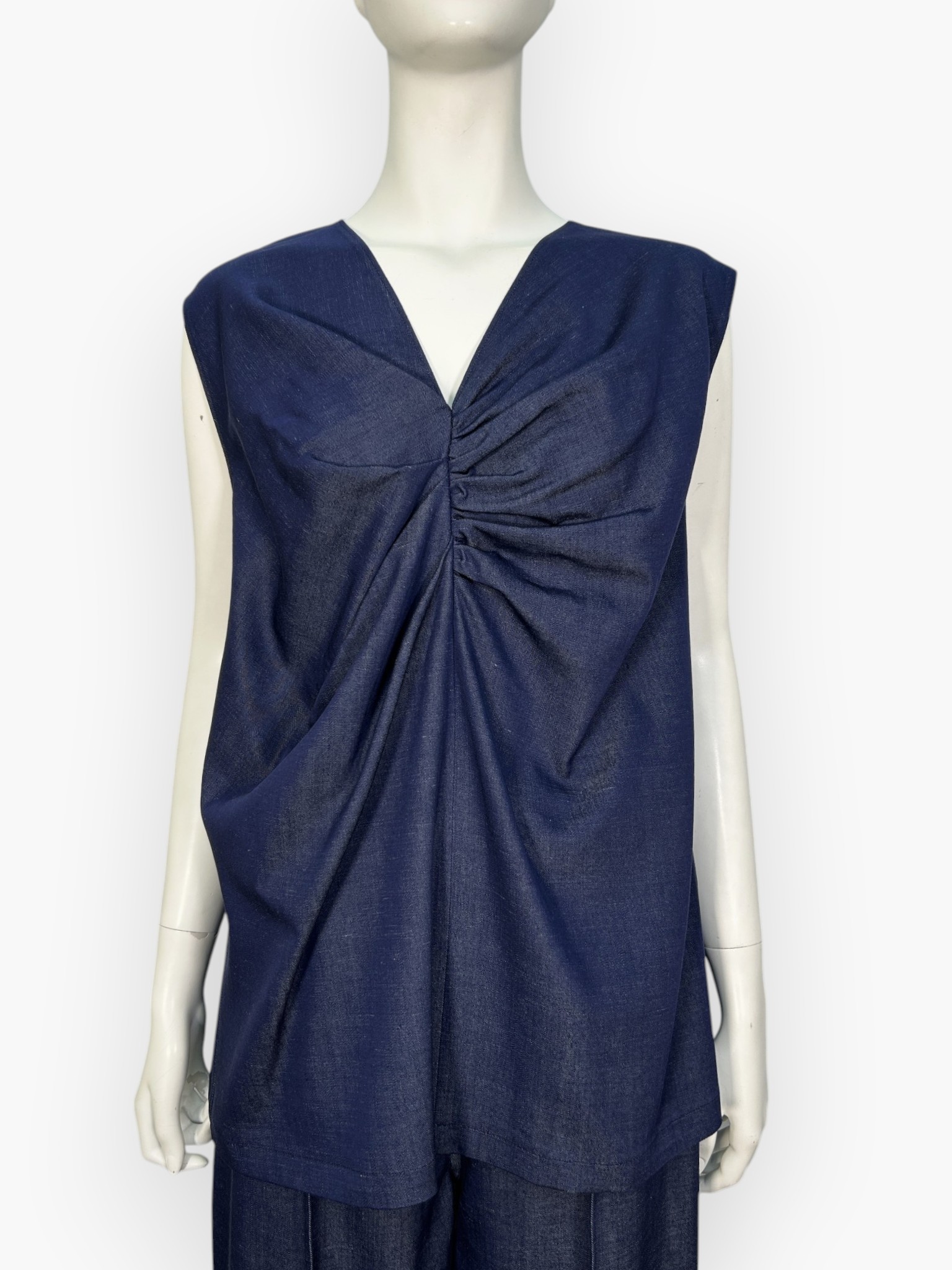 光沢感のあるデニム調の素材をツイストして、新鮮な動きを持たせたプルオーバージレ。