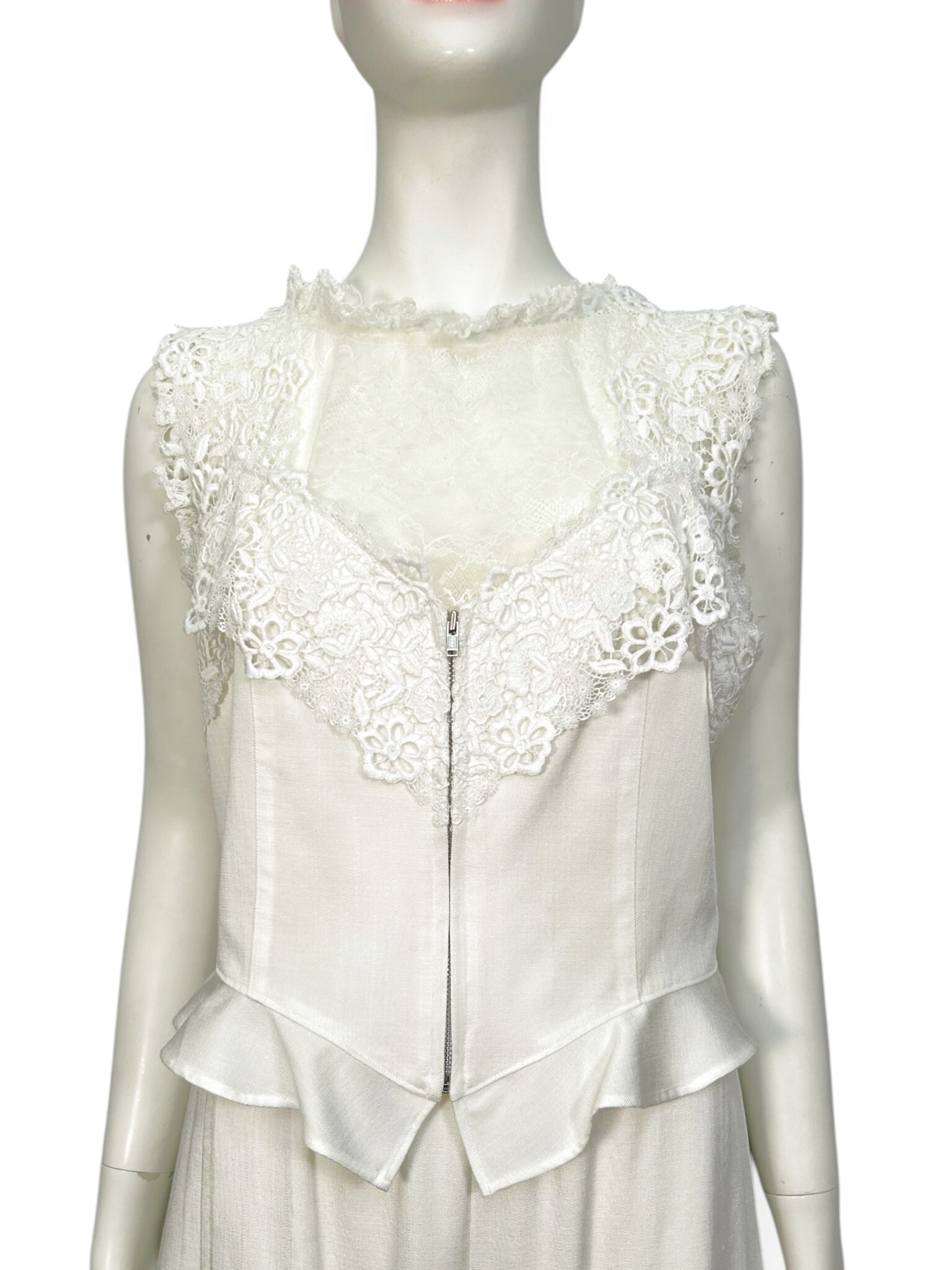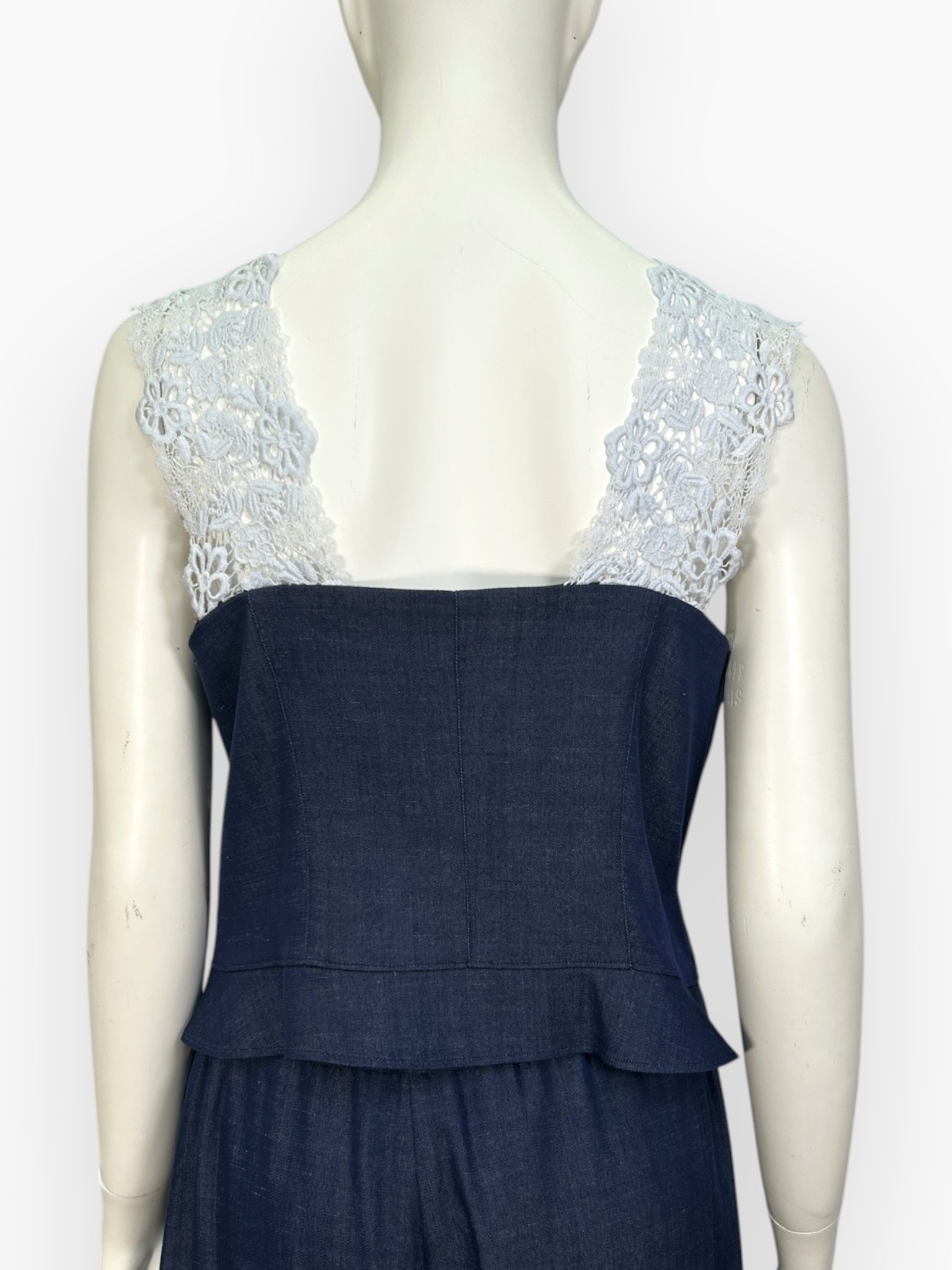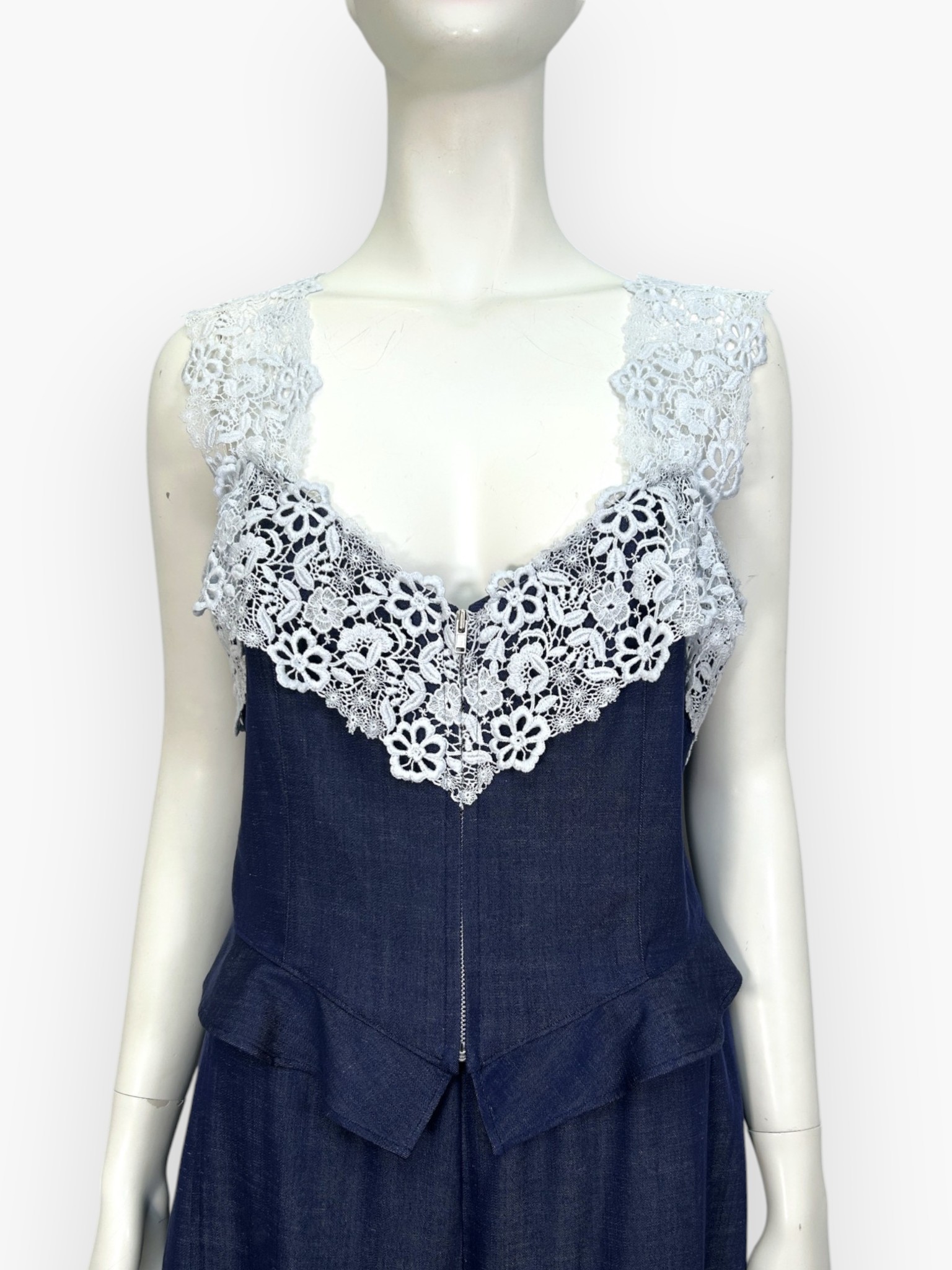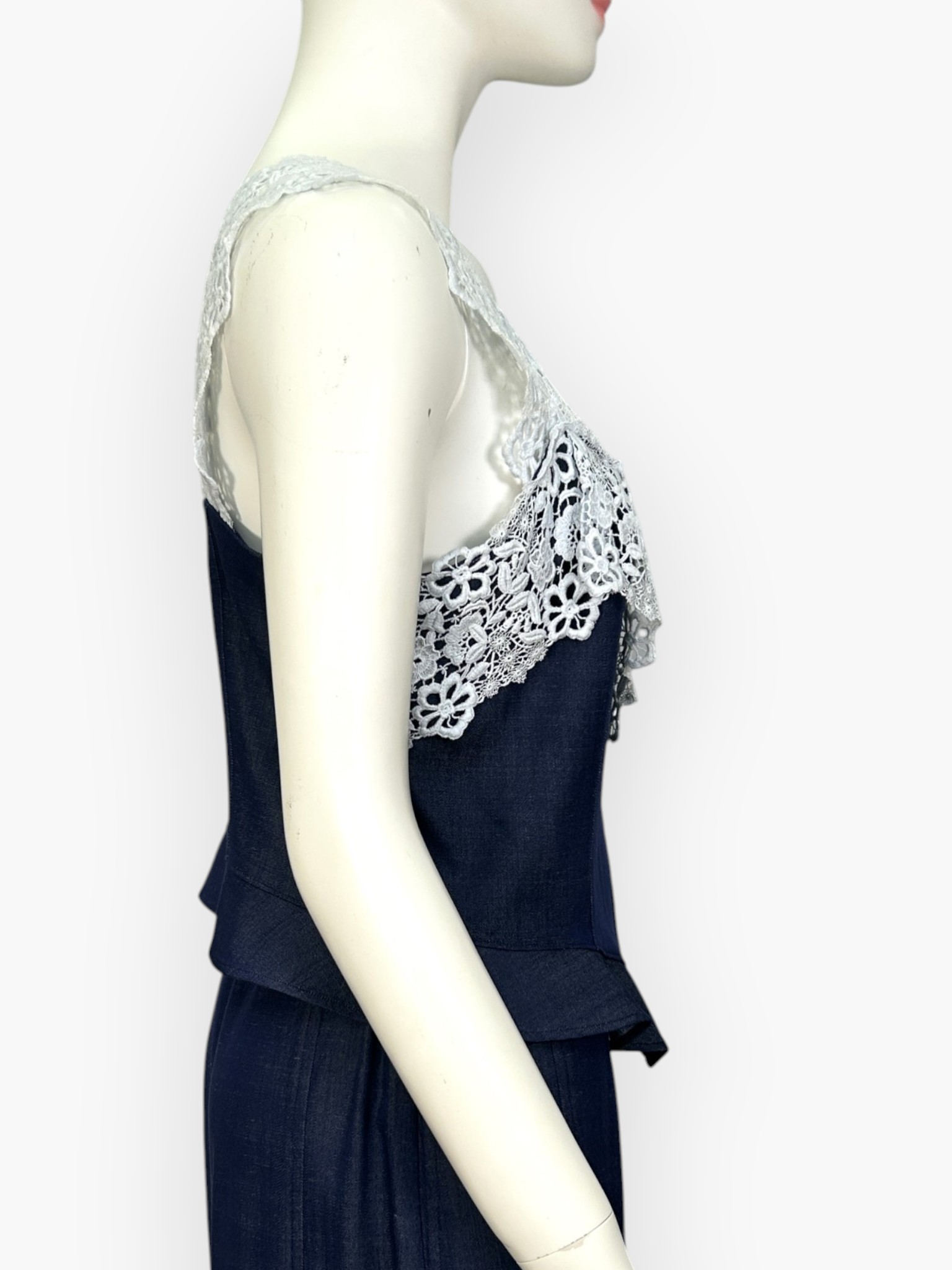 デニムのカジュアルさとコットンレースの甘さがバランスよくミックスされた大人っぽいジレ。