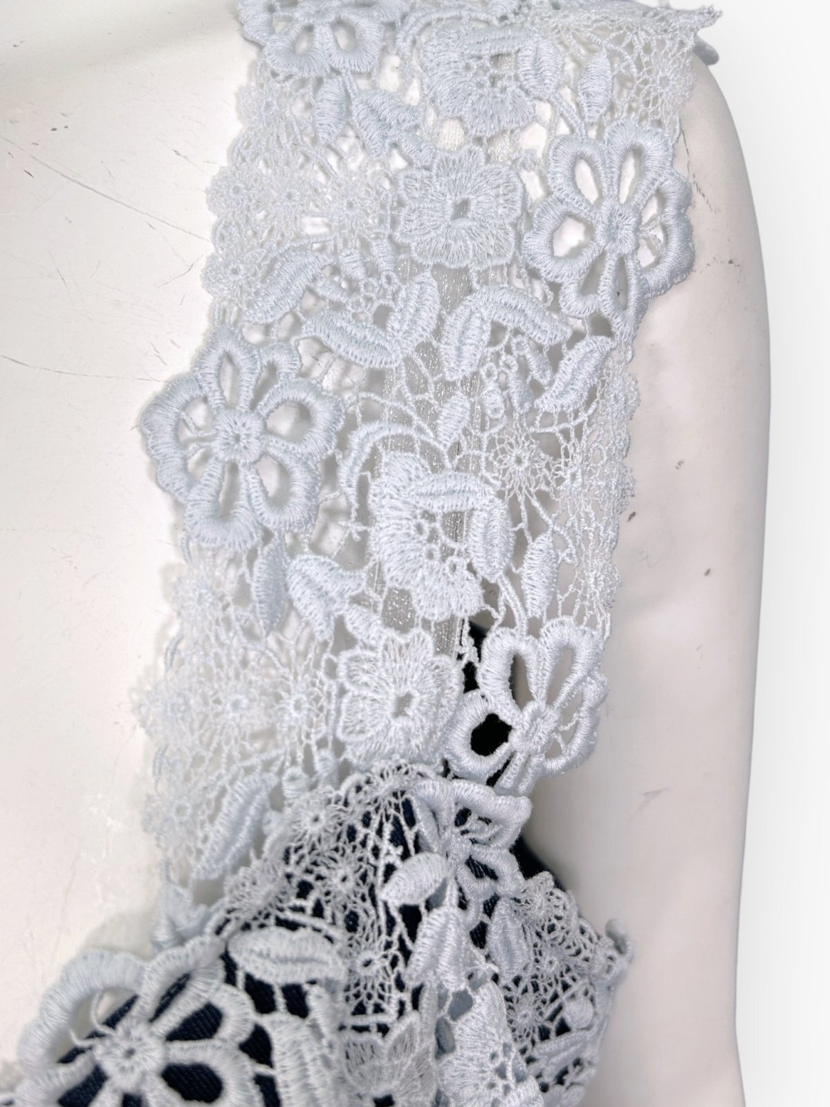 製品洗いを施すことで、コットンレースにデニムの色が移りヴィンテージライクな雰囲気を出しつつ爽やかな色味で新鮮に仕上げた。