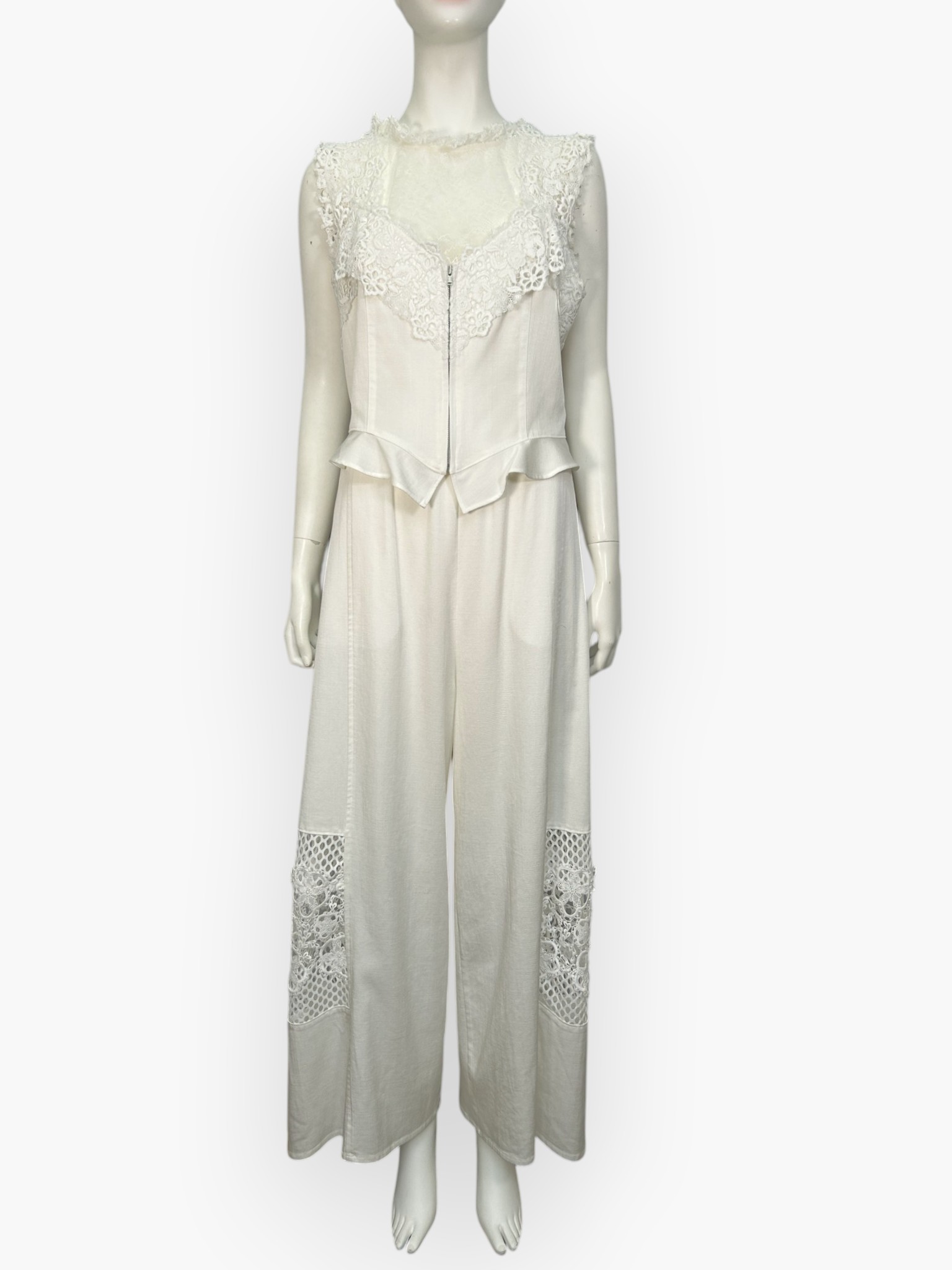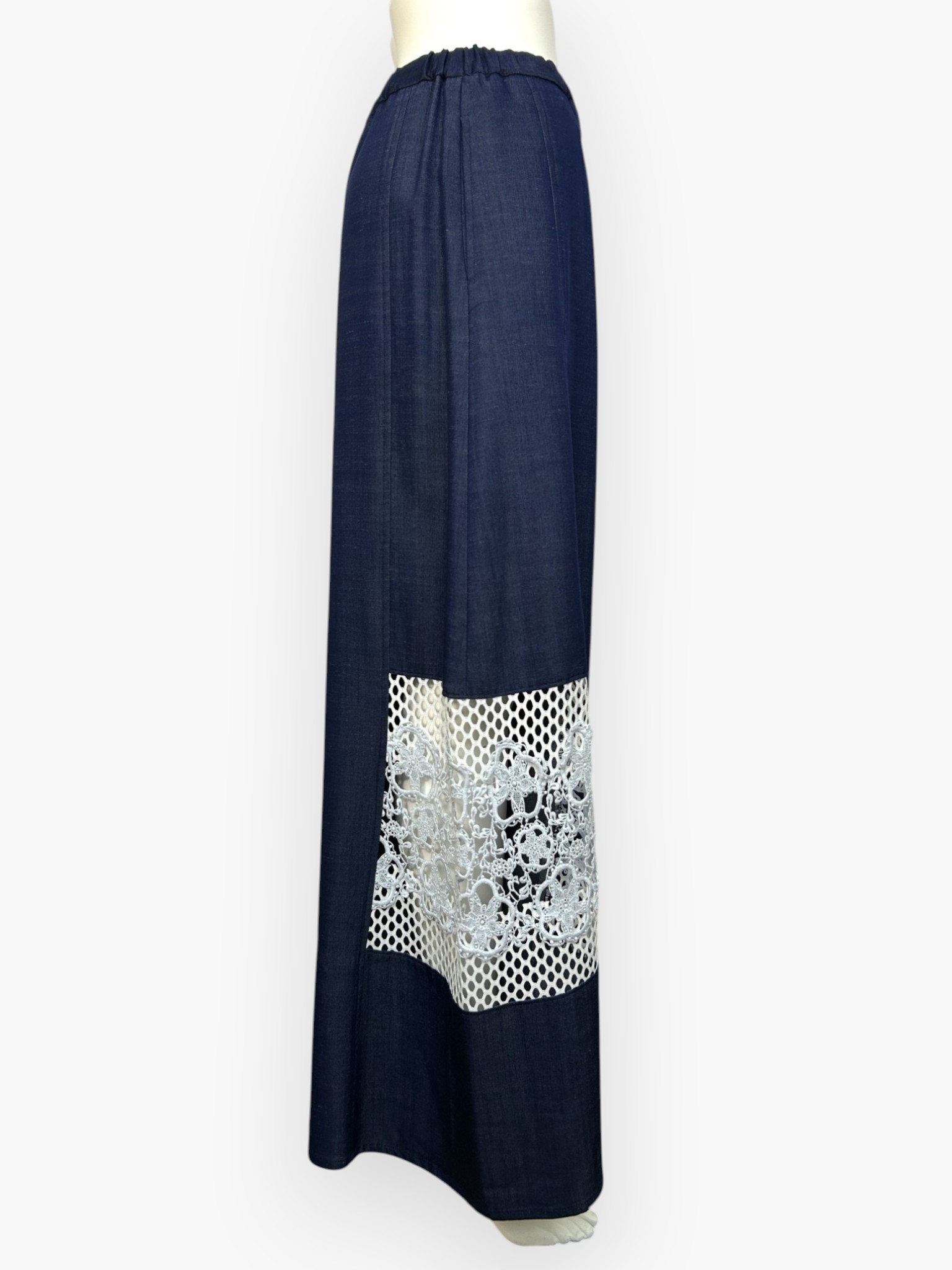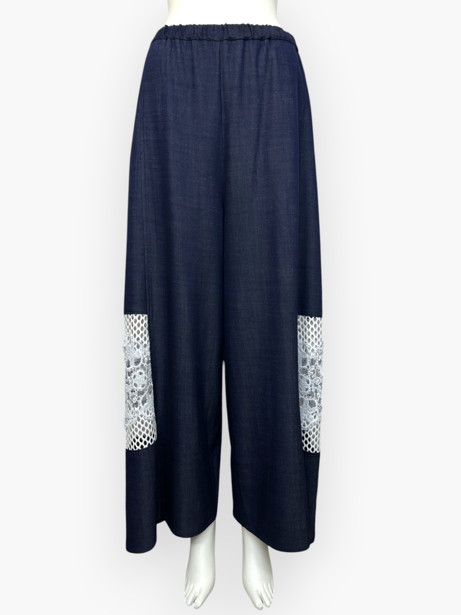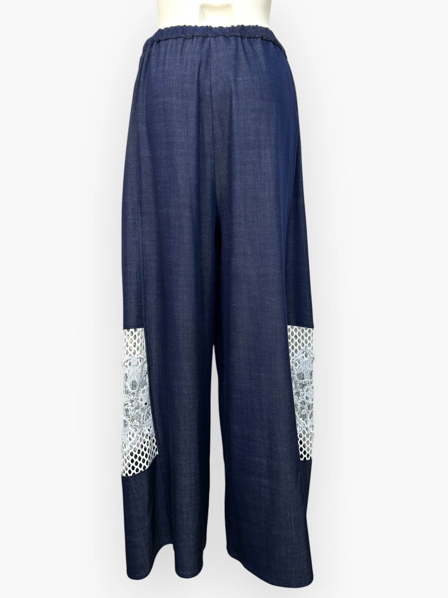 両サイドに施されたレースがアクセントのワイドデニムパンツ。