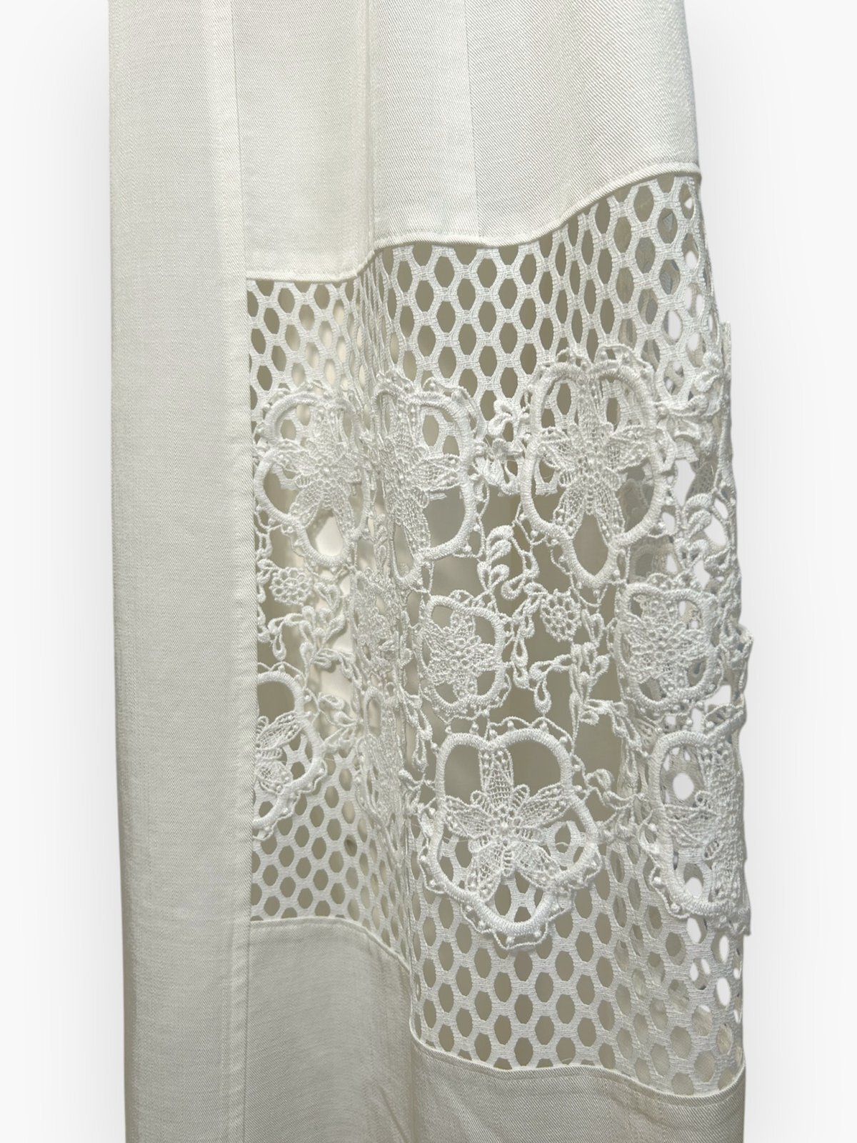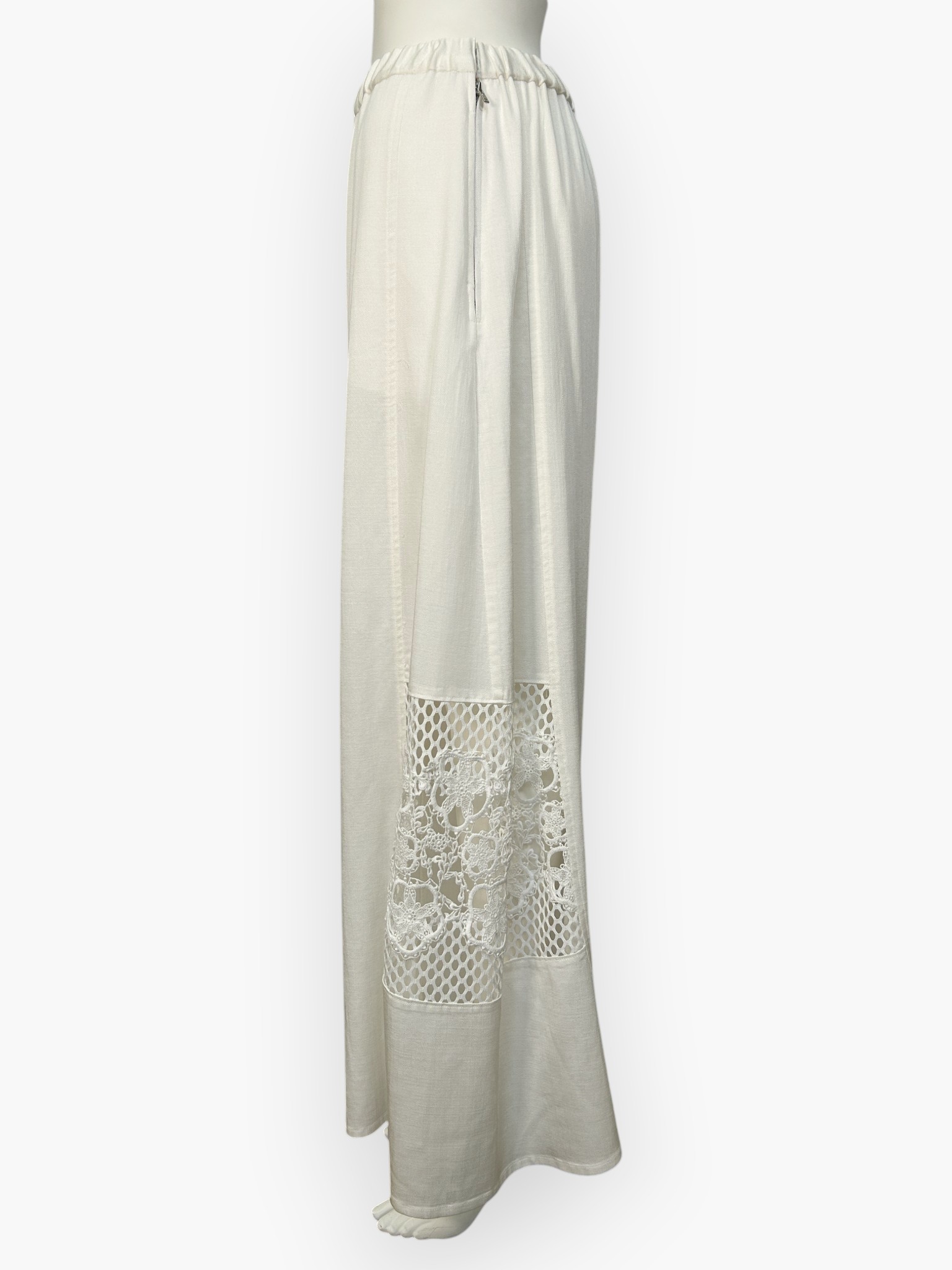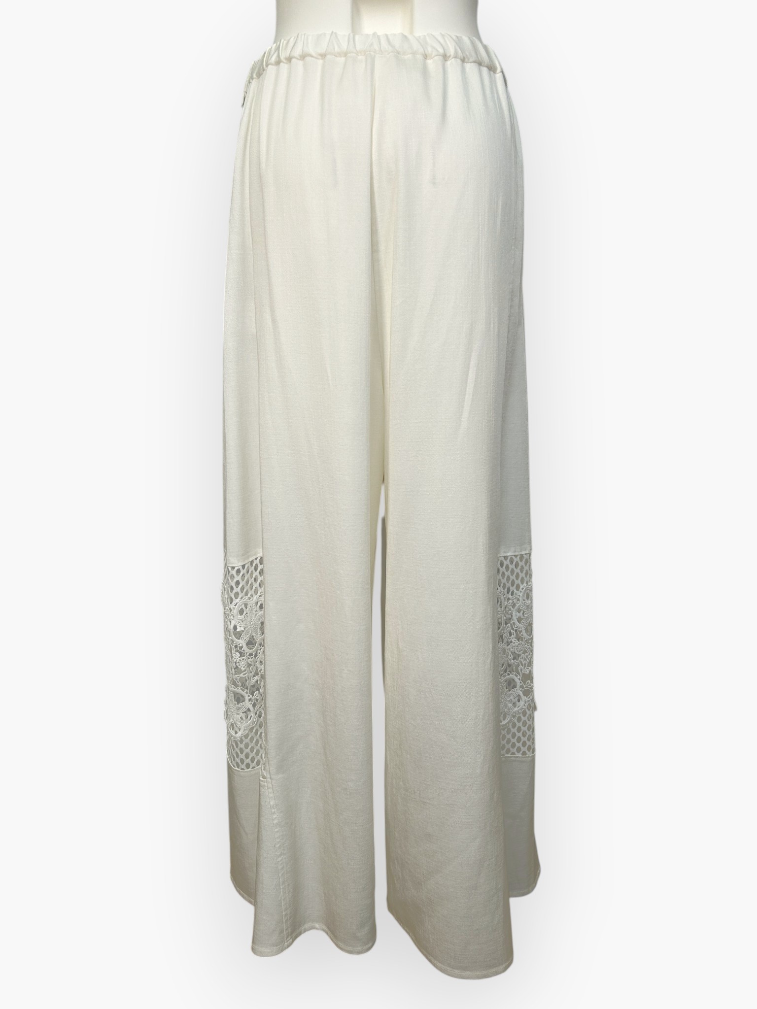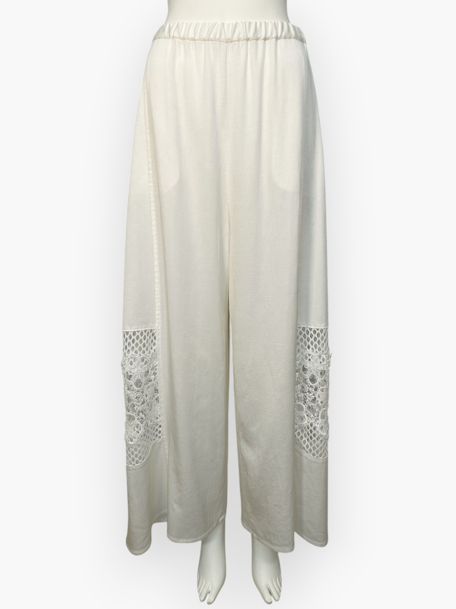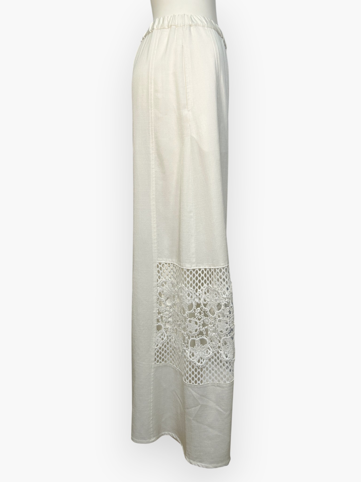 両サイドに施されたレースがアクセントのワイドデニムパンツ。