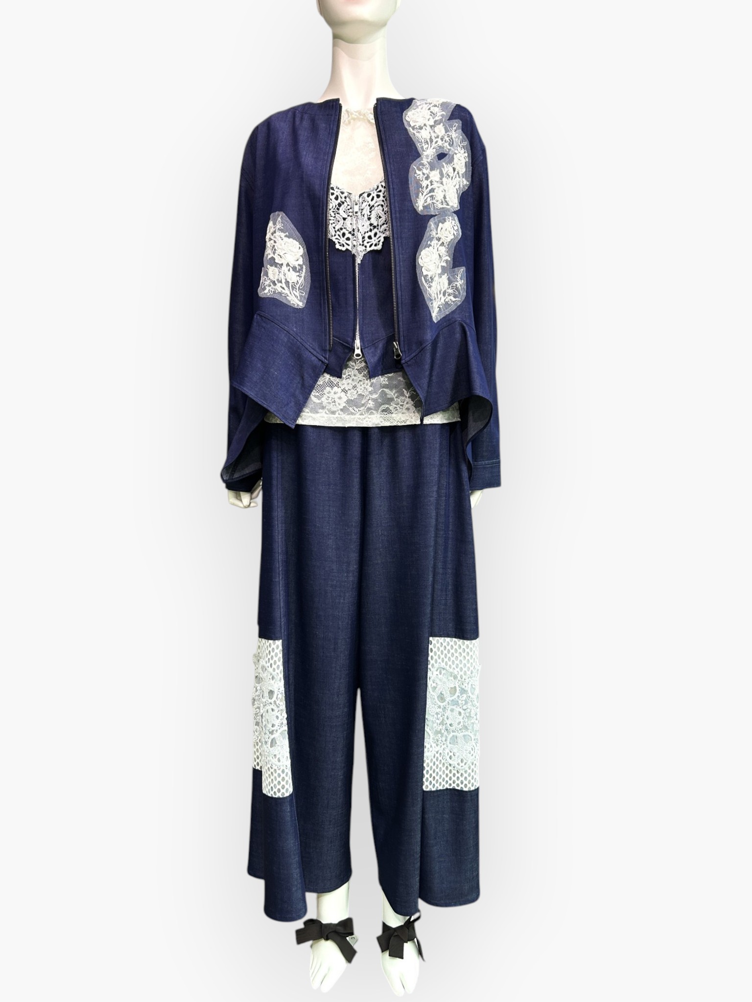 デニムのカジュアルさとレースの甘さがバランスよくミックスされ、トレンド感のある着こなしが楽しめます。
